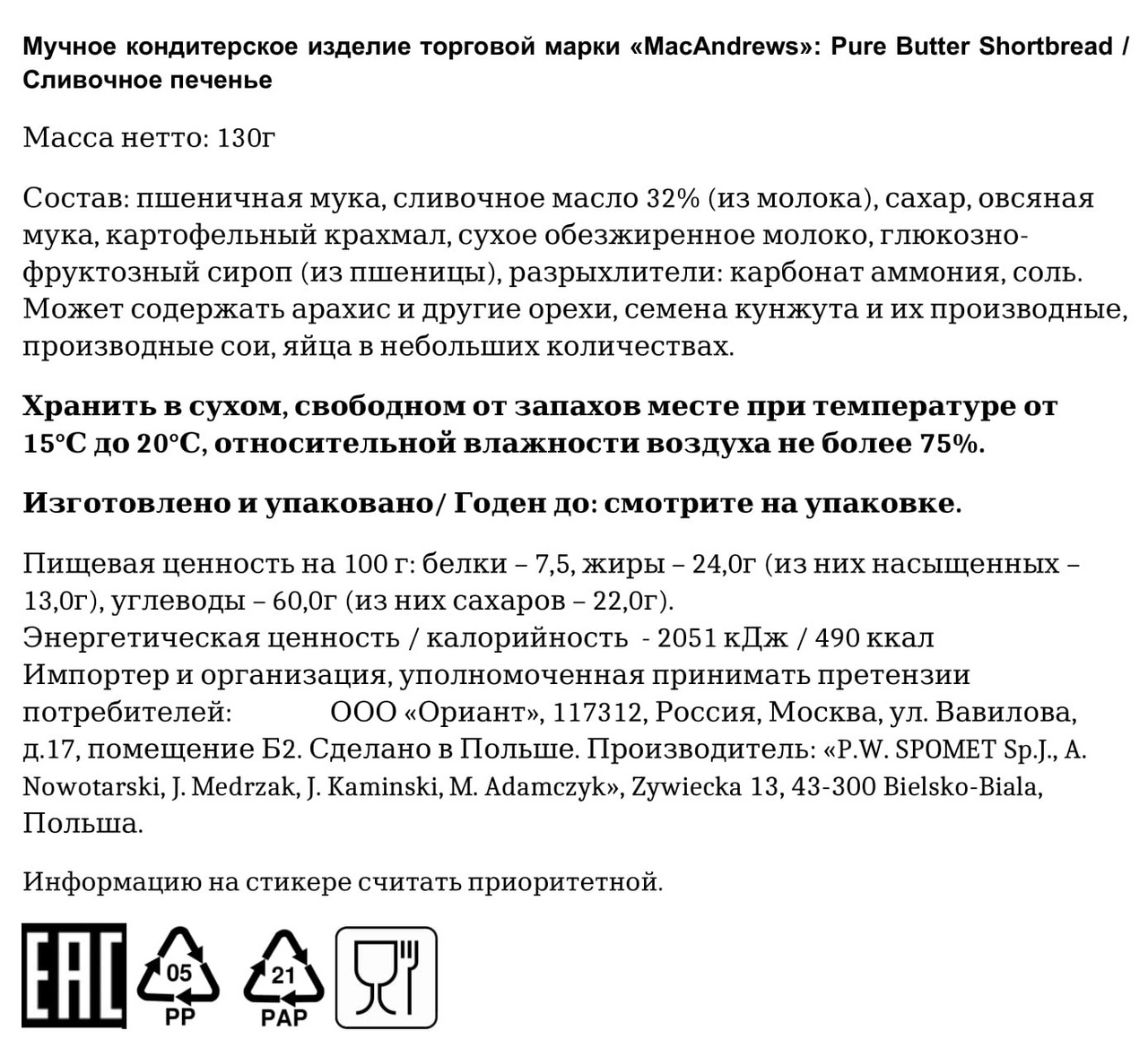 Крупнейший польский производитель кондитерских изделий выпускает свою продукцию уже более 30 лет, высокое качество которой подтверждено международными сертификатами. Печенье под премиальным брендом Mac Andrews на фабрике производится самое лучшее печенье, имеющее натуральный состав и невероятный вкус. Шотландское песочное классическое печенье с ванилью и морской солью. Приготовлено без яиц, поэтому очень воздушное, рассыпчатое и хрупкое.