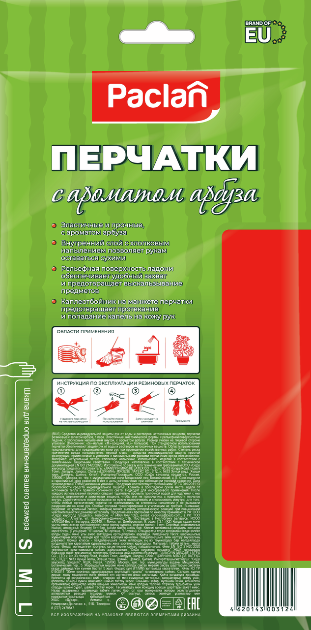 Перчатки Paclan с ароматом арбуза прекрасно подходят для защиты рук при выполнении хозяйственных работ по дому. Лёгкие и прочные, 100% хлопковое напыление. С ароматом арбуза, Яркий цвет перчаток. Сертифицированные. Рельефная поверхность ладони обеспечивает удобный захват и предотвращает выскальзывание предметов. Специальный каплеотбойник на манжете перчатки предотвращает протекание и попадание капель на кожу рук. Перчатки изготовлены из высокопрочного сырья, выдерживающего многократное использование. При повреждениях (проколы, порезы перчатки отверстия не расползаются. Предназначены для защиты рук при выполнении хозяйственных работ по дому. Рельефная поверхность ладони обеспечивает удобный захват и предотвращает выскальзывание предметов.