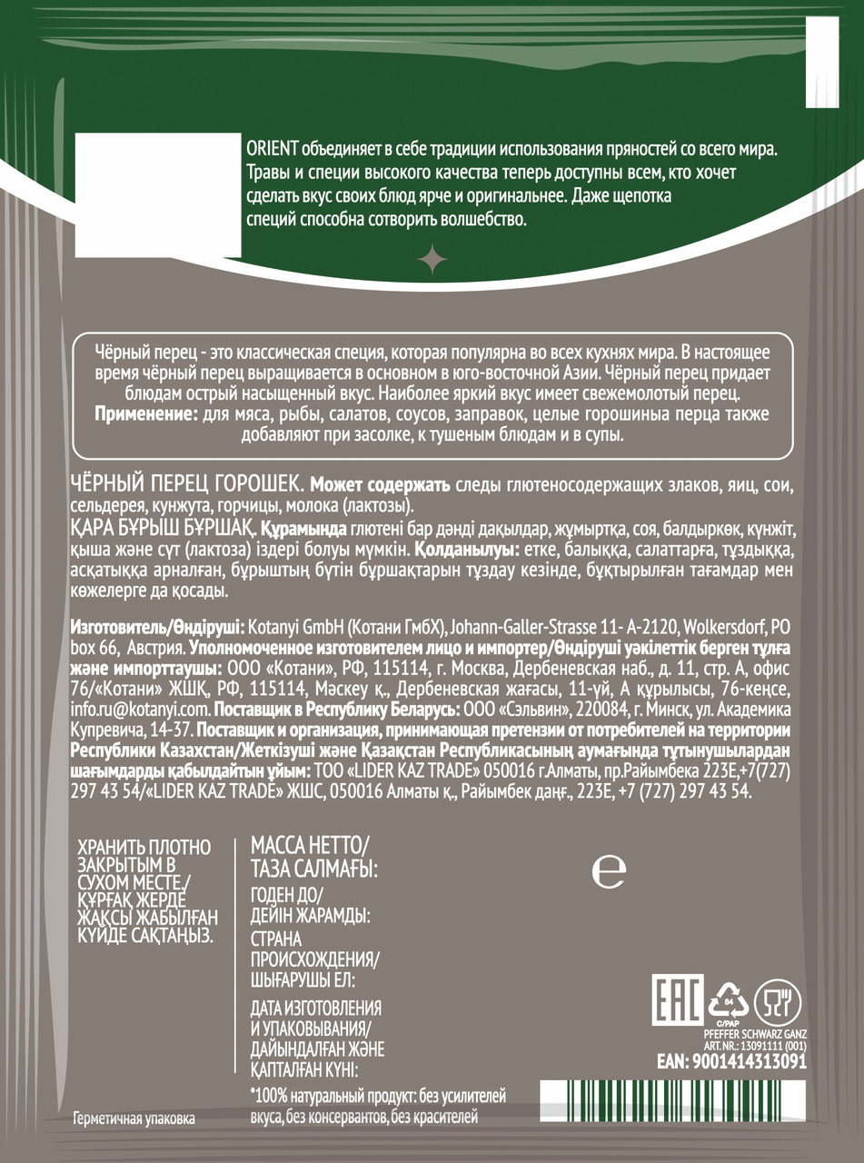 Перец черный горошек Orient, 10г — король среди пряностей. Эта специя представляет собой высушенные недозрелые плоды тропической лианы. Чаще всего перец в виде горошка используется в кулинарии во время приготовления маринадов, соусов и консервов из мяса, рыбы, овощей, а также супов и бульонов. Данную приправу помещают в блюдо в самом начале готовки, так как горошек не имеет той остроты и пряности, как у молотого перца. Представленная специя оказывает на организм ряд положительных свойств: повышает аппетит и нормализует пищеварение, стимулирует выработку желудочного сока, ускоряет метаболизм и способствует быстрому похудению, улучшает состояние кожи, волос и ногтей. Эту приправу даже рекомендуют в регулярному употреблению людям, страдающим от витилиго (заболевание, при котором кожа в некоторых участках не имеет пигментации и приобретает белый цвет). Пиперин, содержащийся в черном перце, в сочетании с ультрафиолетовым излучением стимулирует выработку пигмента меланина, отвечающего за цвет кожи.