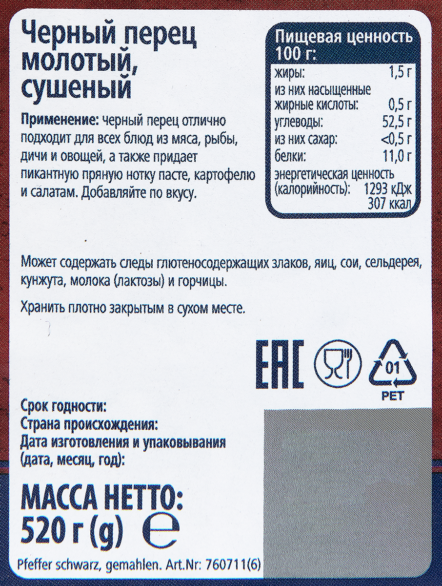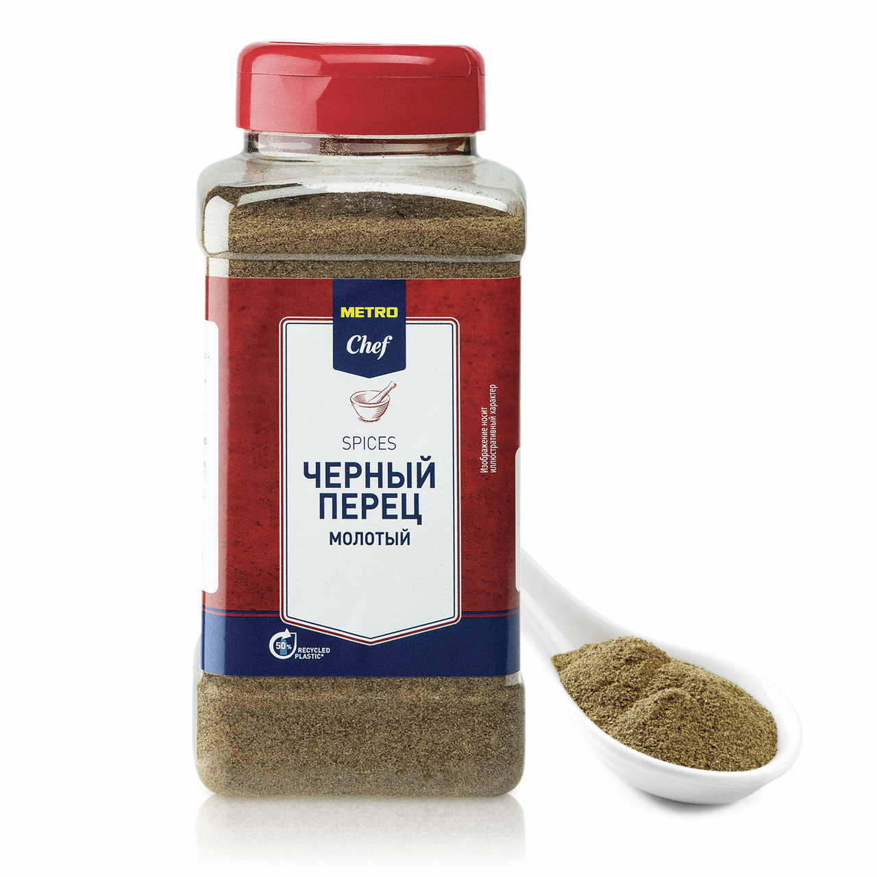Перец черный METRO Chef молотый, 520 г – одна из популярных и широко известных пищевых добавок, которая есть практически на каждой кухни. Она вносит в кулинарную композицию особую пряную ноту и придает ей пикантную перчинку. Эту пряность получают из высушенных недозревших плодов древовидной лианы. Сильный аромат и горько-жгучий вкус черного перца объясняется тем, что он содержит эфирные масла и алкалоид пиперина. При этом эта пряность включает в себя массу полезных веществ, среди которых есть как витамины, так и различные минералы. Данный продукт способствует нормализации обмена веществ, улучшению кровообращения и пищеварения. Его используют для приготовления всех видов мяса и рыбы, разнообразных супов, подлив и соусов, а также овощных салатов и маринадов. Также черный отлично подходит для фарша.