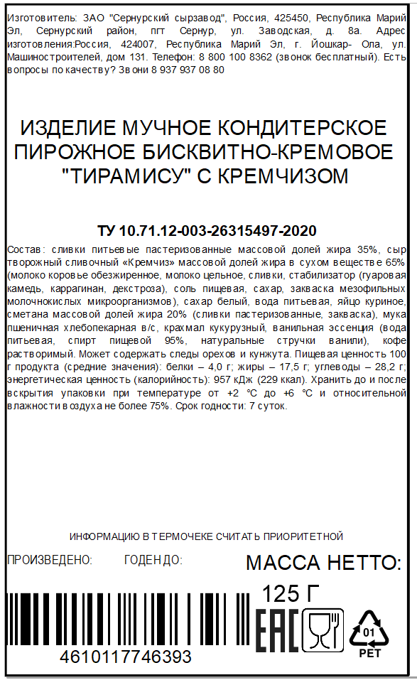 Пирожное бисквитно-кремовое Сернур Тирамису с кремчизом, 125г