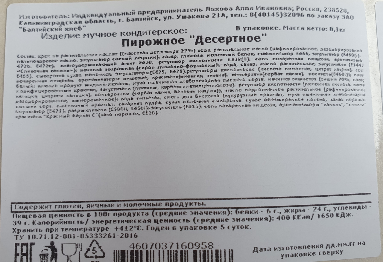 Крем на растительных маслах (вода, растительное масло рафинированное, дезодорированное пальмоядровое масло, эмульгатор соевый лецитин, сахар, глюкоза, молочный белок, стабилизатор Е466, эмульгатор Е460i, Е 472b, E472e, влагоудерживающий агент Е420, регулятор кислотности Е339ii, соль поваренная пищевая, ароматизатор Сливочная ваниль); начинка творожная (сироп глюкозно-фруктозный, вода, сахар, масло растительное, загустители Е1442, Е466, сыворотка сухая молочная, эмульгаторы Е475, Е471, регуляторы кислотности кислота лимонная, цитрат натрия), соль поваренная пищевая, ароматизаторы пищевые, краситель диоксид титана, консервант сорбат калия, носитель Е460i; сахар белый; яичный продукт жидкий-меланж; мука пшеничная хлебопекарная высшего сорта, начинка вишневая вишня, сахар, модифицированный крахмал, загустители пектины, карбоксиметилцеллюлоза, регулятор кислотности лимонная кислота, лактат кальция, цитраты кальция, консерванты сорбат калия, бензоат натрия; масло подсолнечное растительное рафинированное, дезодорированное, вымороженное; вода питьевая; смесь для бисквита кукурузный крахмал, мука пшеничная хлебопекарная высший сорт, пшеничный крахмал, сахарная пудра, сухая молочная сыворотка, сухое обезжиренное молоко, какао порошок, эмульгатор Е471, разрыхлители Е500ii, Е450i; загуститель Е415, соль поваренная пищевая, ароматизаторы ваниль, сливки, краситель Красный бархат С какао-порошок, Е120.