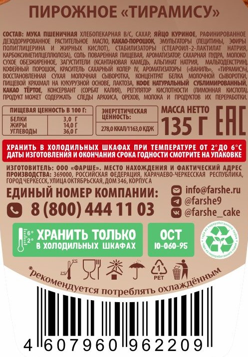 Мука пшеничная хлебопекарная, сахар, яйцо куриное, рафинированное дезодорированное растительное масло, какао-порошок, эмульгаторы лецитины, эфиры полиглицерина и жирных кислот, стабилизаторы стеароил-2-лактилат натрия, карбоксиметилцеллюлоза, соль пищевая, ароматизатор, пудра сахарная, молоко сухое обезжиренное, загустители ксантановая камедь, альгинат натрия, мальтодекстрин, кофейный порошок, краситель сахарный колер IV, ароматизаторы Ваниль, Тирамису, восстановленная сухая молочная сыворотка, концентрат белка молочной сыворотки, пищевой крахмал на кукурузной основе, лактоза, кофе натуральный сублимированный, какао тёртое, сахарная пудра, консервант сорбат калия, регулятор кислотности лимонная кислота.