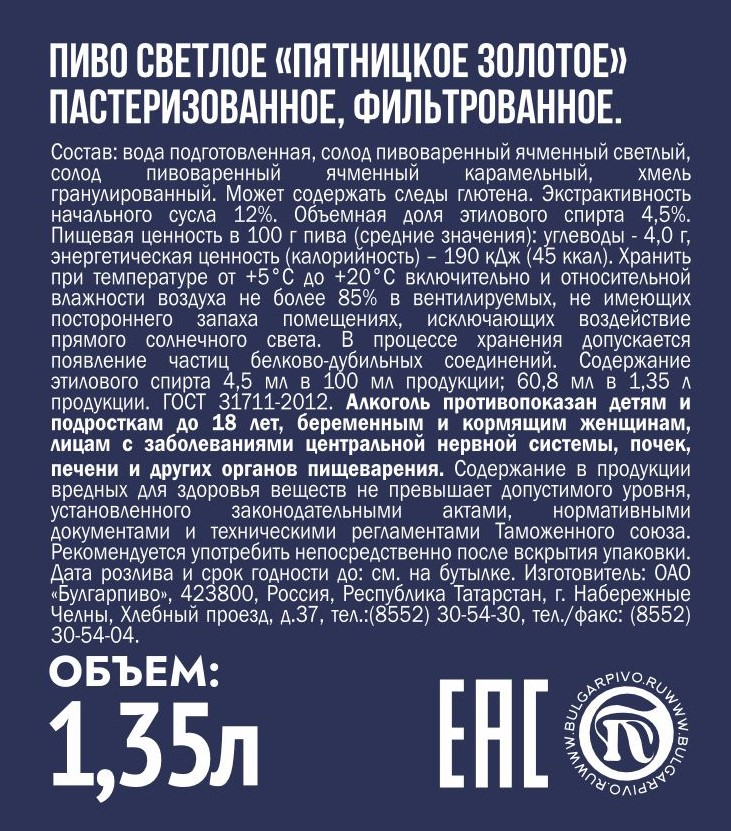 Пиво Булгарпиво Пятницкое золотое светлое, 1.35л