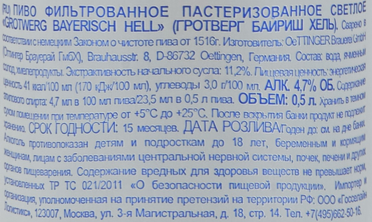 Пиво светлое Grotwerg лагер железная банка, 0,5 л обладает тонким выраженным ароматом, в котором чувствуются деликатные нотки свежеиспеченного хлеба. Напиток светло-янтарного цвета с золотистыми оттенками красиво искрится в бокале, а высокая пенная шапка держится некоторое время. Фильтрованное Пиво отличается сбалансированным вкусом: едва заметная горечь хмеля гармонично переплетается с легкой сладостью солода. Алкоголь рекомендуется подавать охлажденным — понижение температуры позволяет полностью раскрыть все вкусовые характеристики. Пенный напиток идеально сочетается с плотными и сытными блюдами немецкой кухни. Он отлично подойдет к жареным колбаскам, мясной тарелке, запеченной свинине и приготовленной на решетке гриль рыбе. Пиво дополнят различные сыры, моллюски, креветки и другие морепродукты, а также фисташки, арахис, сухарики, чипсы и крекер.