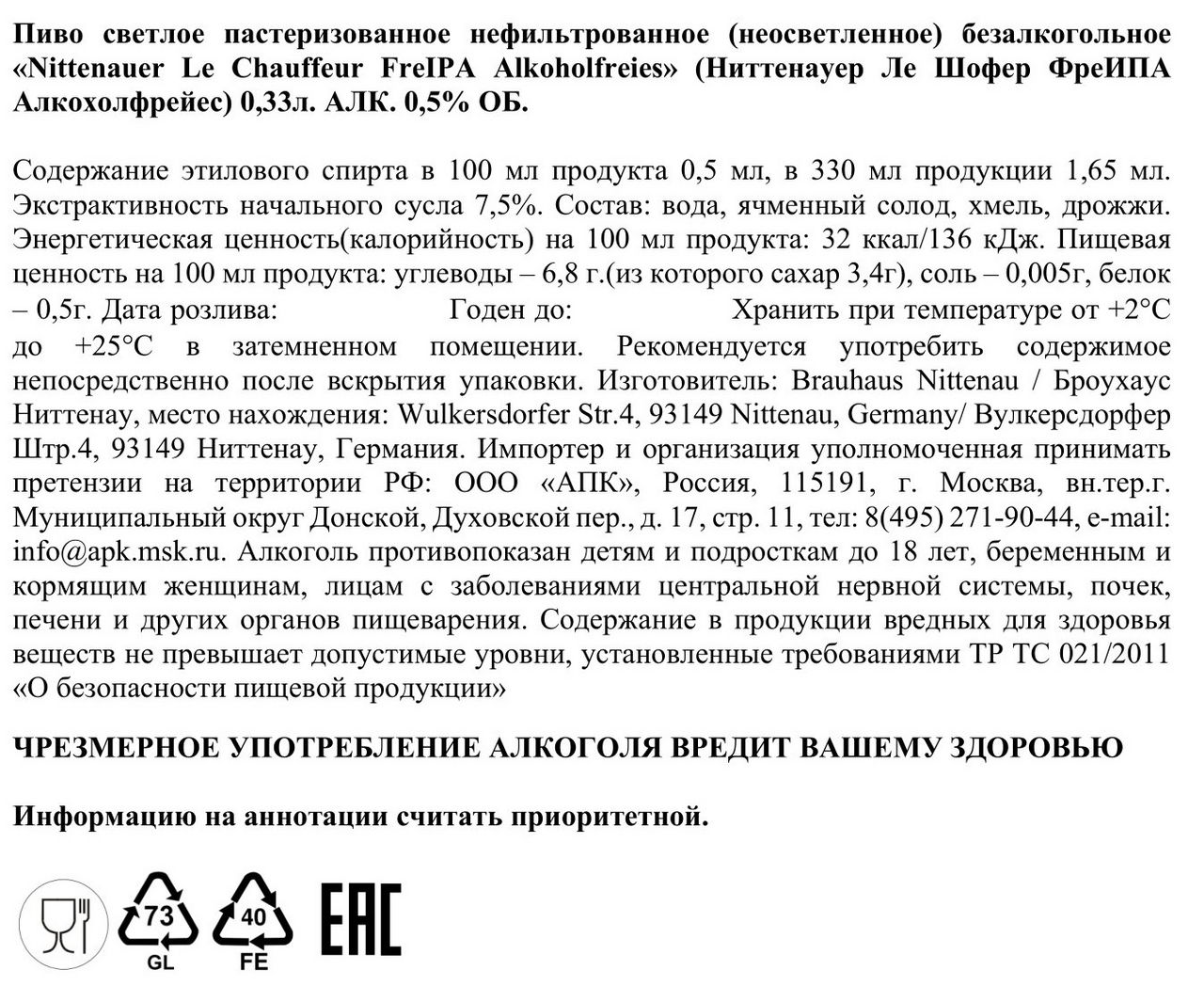 Пиво Nittenauer Le Chauffeur Freipa безалкогольное, 0.33л