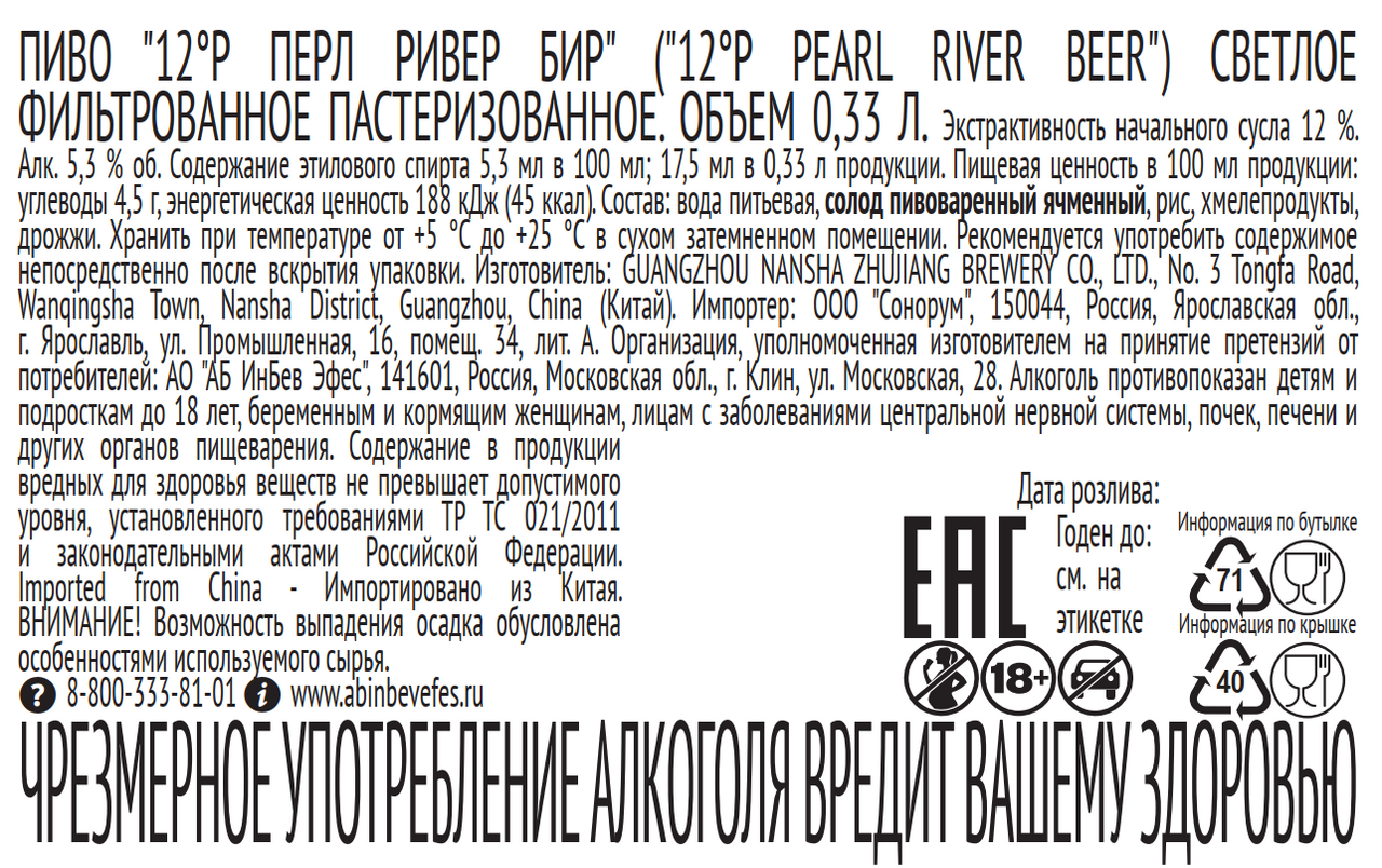 Pearl river Beer - Двадцатилетний опыт пивоварения с использованием передовых международных технологий. Производство из высококачественного импортного солода, хмеля и дрожжей. Солодовый профиль. Богатый аромат. Умеренная горечь. Это классический лагер, тщательно сваренный с использованием импортного ячменного и карамельного солода, риса, хмеля и пивных дрожжей Чжуцзян. В производстве также используется качественная родниковая вода, которая очищается слой за слоем, благодаря чему каждый глоток становится чистым и освежающим. Насыщенный солодовый аромат и долгий, полный вкус этого пива стали классикой жанра на улицах и переулках Лао Гуана. Идеально сочетается с блюдами традиционной китайской кухни, закусками и снэками.