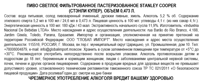 Пиво Stanley Cooper светлое фильтрованное, 0.473л