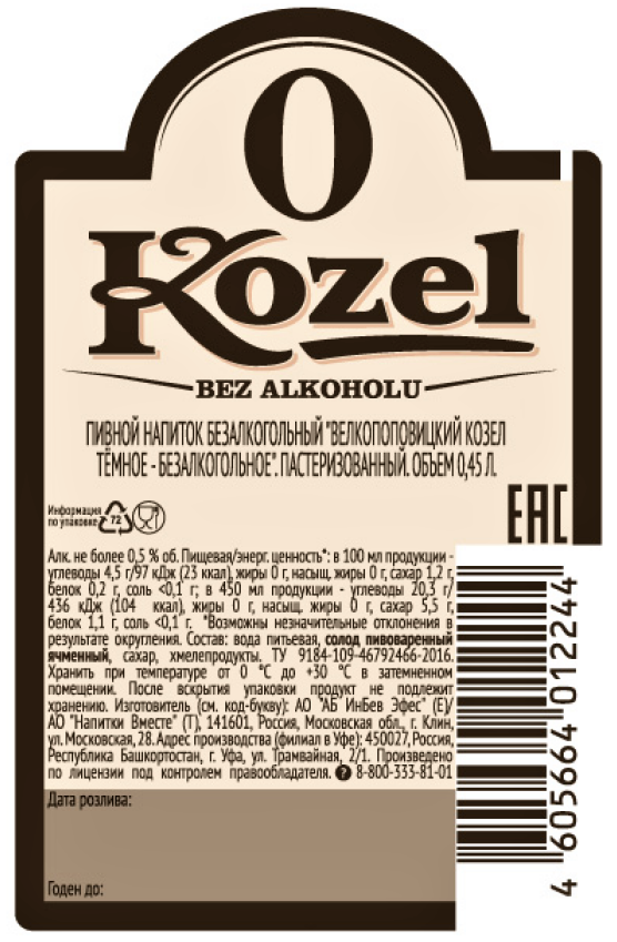 Пиво Velkopopovicky Kozel темное безалкогольное, 0.45л
