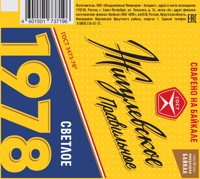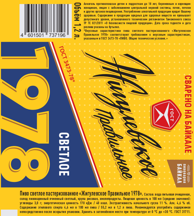 Пиво Жигулевское Правильное 1978 светлое, 1.2л