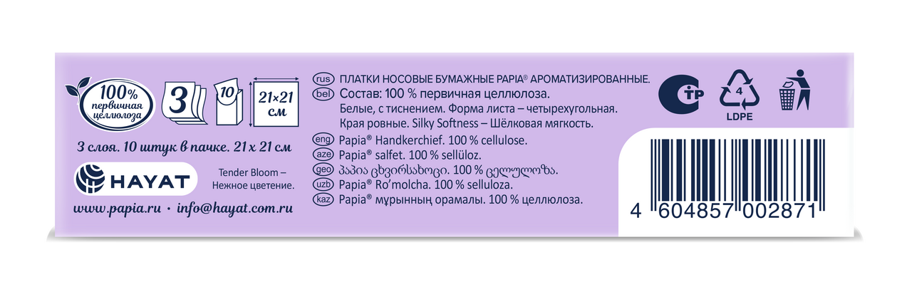Носовые платочки Papia легко поместятся в сумку. Нежные и мягкие, они удивят вас своим высоким качеством. Трехслойные носовые платочки из 100 % натуральной целлюлозы очень впитывающие и прочные. Их легкий и нежный аромат приятно удивит вас. Трехслойные, нежные и мягкие носовые платочки из 100% натуральной целлюлозы прочные и отлично впитывают влагу. Приятный цветочный аромат, легко помещаются в сумку.