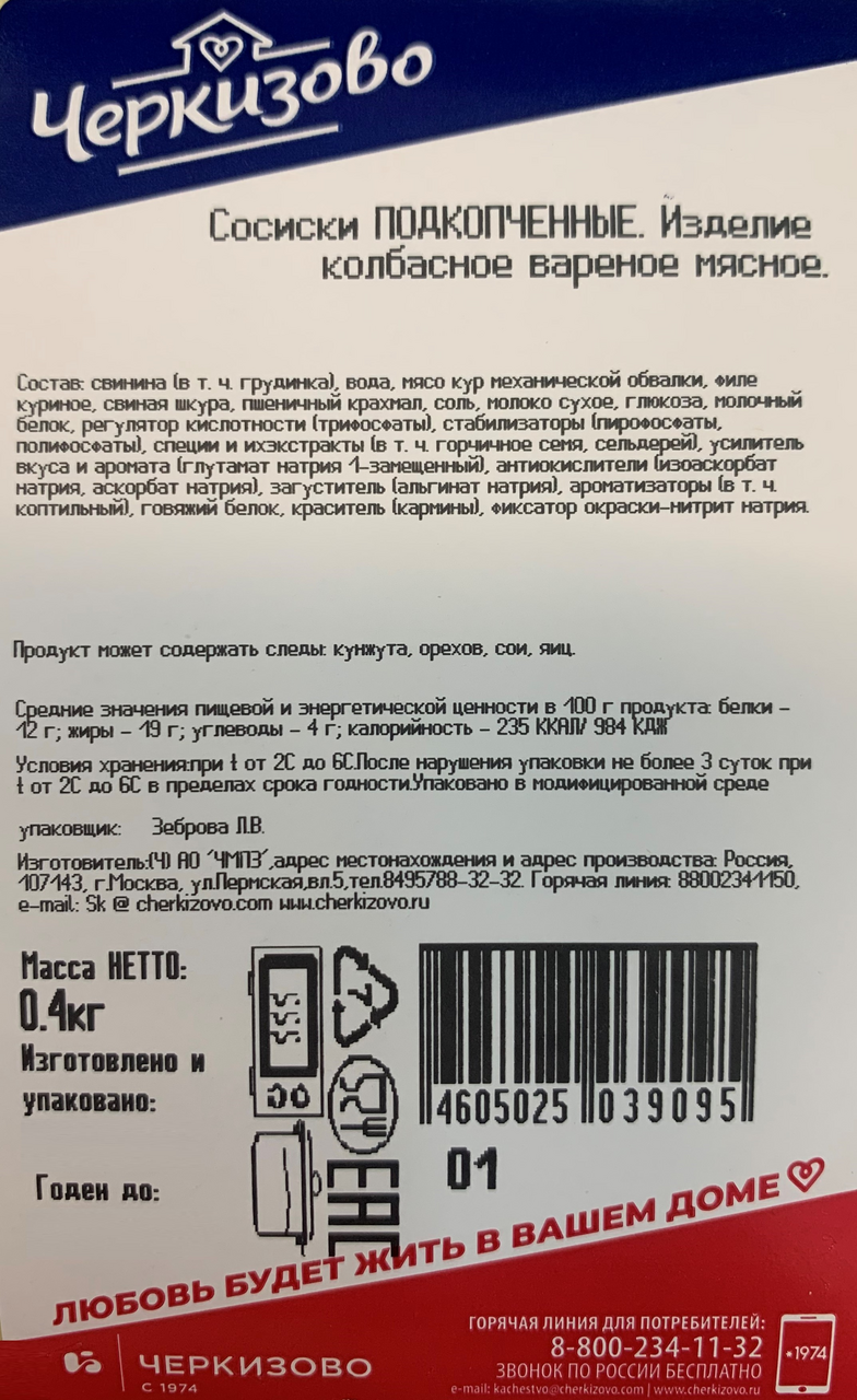 Свинина (в т. ч. грудинка), вода, мясо кур механической обвалки, филе куриное, свиная шкура, пшеничный крахмал, соль, молоко сухое, глюкоза, молочный белок, регулятор кислотности (трифосфаты), cтабилизаторы (пирофосфаты, полифосфаты), специи и их экстракты (в т. ч. горчичное семя, сельдерей), усилитель вкуса и аромата (глутамат натрия 1-замещенный), антиокислители (изоаскорбат натрия, аскорбат натрия), загуститель (альгинат натрия), ароматизаторы (в т. ч. коптильный), говяжий белок, краситель (кармины), фиксатор окраски-нитрит натрия.