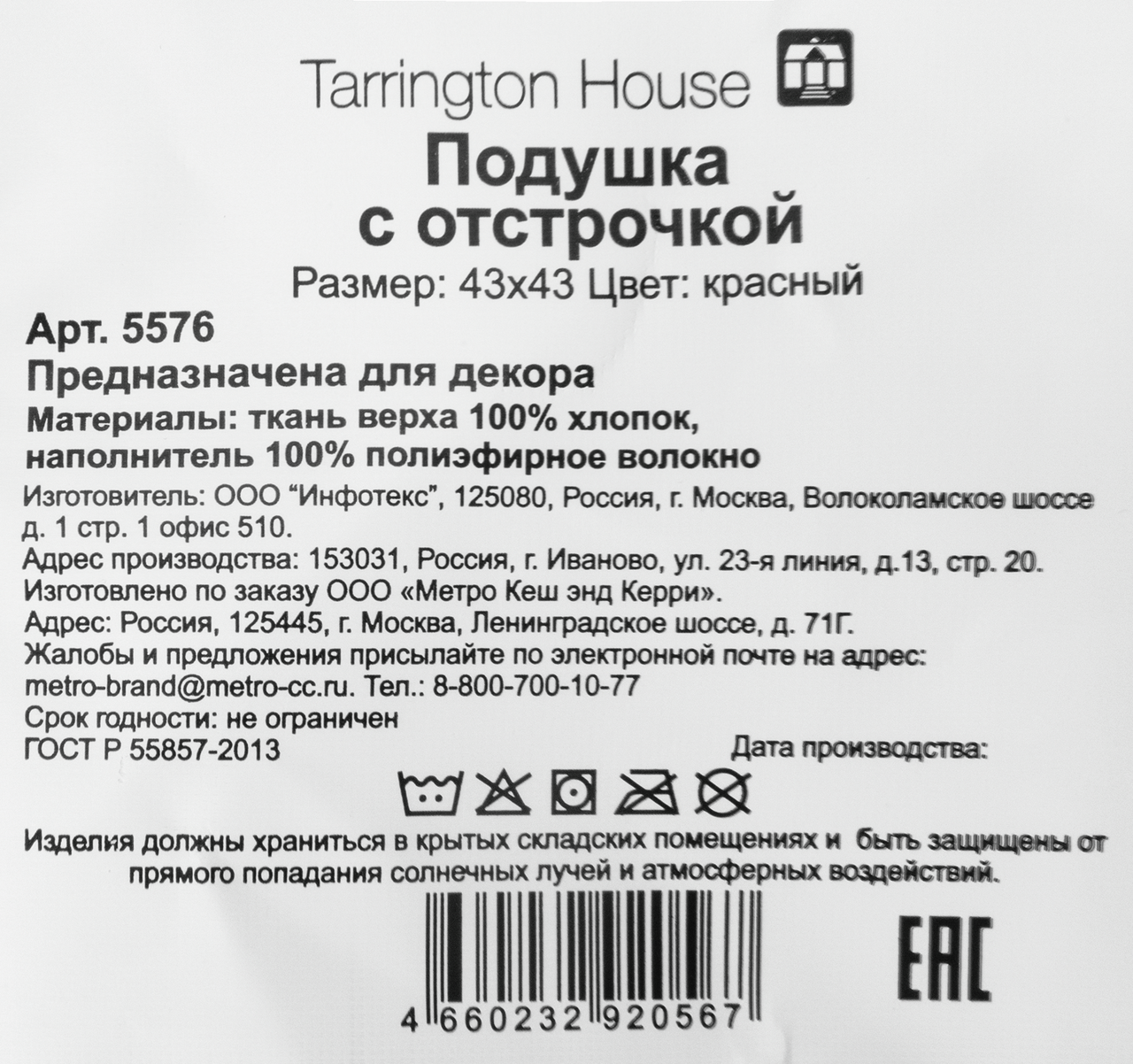 Tarrington House Подушка декоративная красная с отстрочкой, 43 x 43см