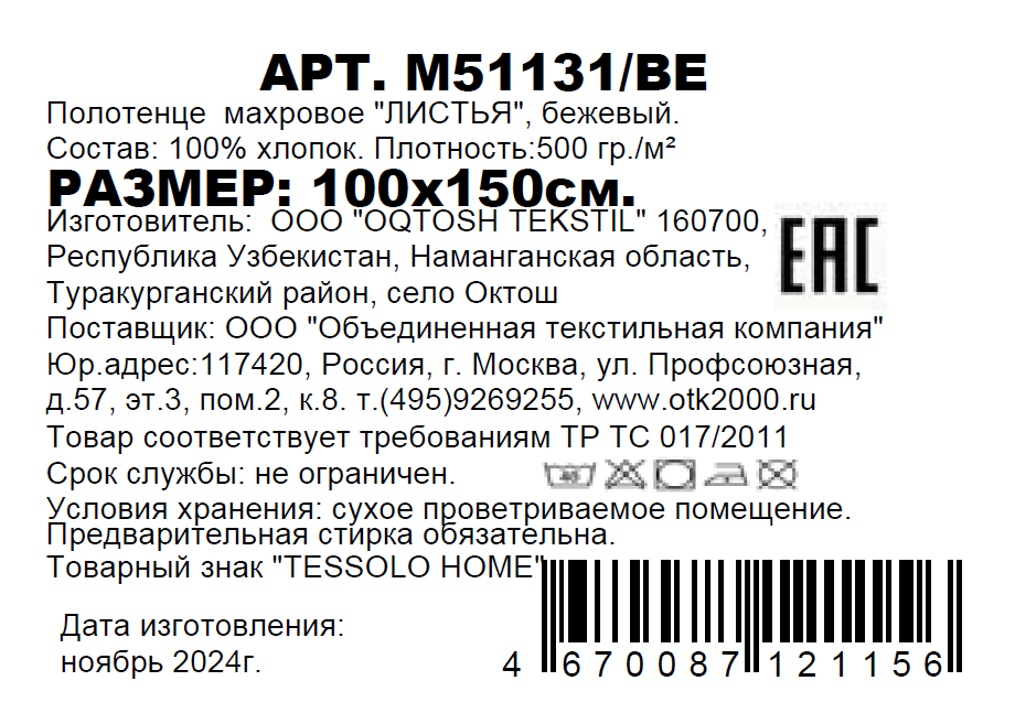 Полотенце Tessolo Home Листья махровое бежевое 500г, 100 x 150см