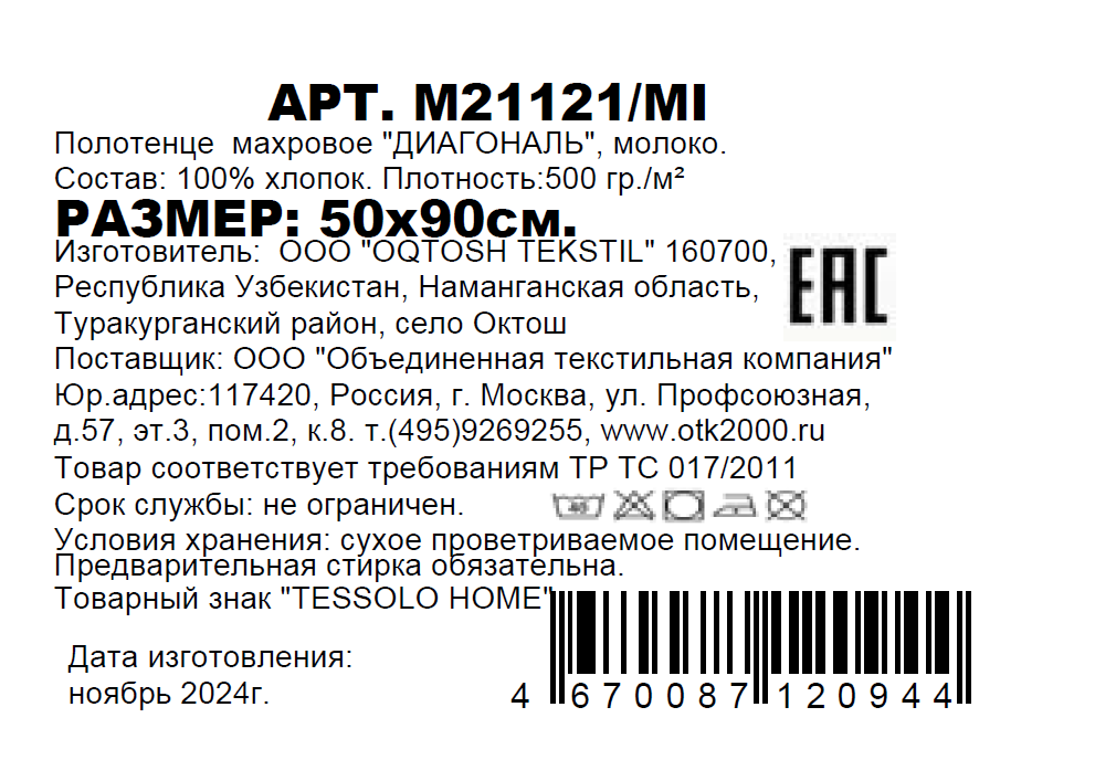 Полотенце Tessolo Home махровое диагональ молочного цвета, 50 x 90см
