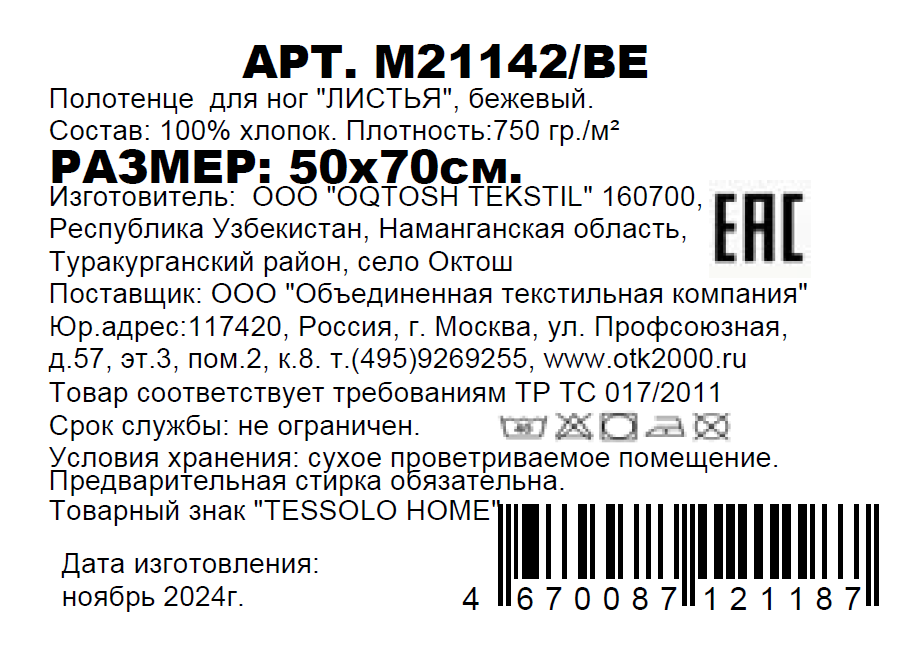 Полотенце для ног Tessolo Home махровое бежевое 750г, 50 x 70см