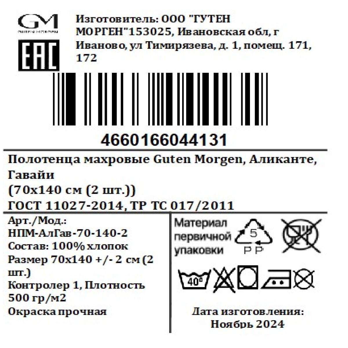Полотенце махровое Guten Morgen Аликанте Гавайи 70 x 140см, 2шт