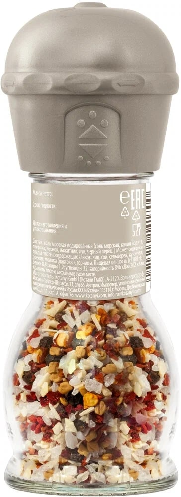 Соль морская йодированная (соль морская, калия йодат), паприка, чеснок, пажитник, лук, черный перец.