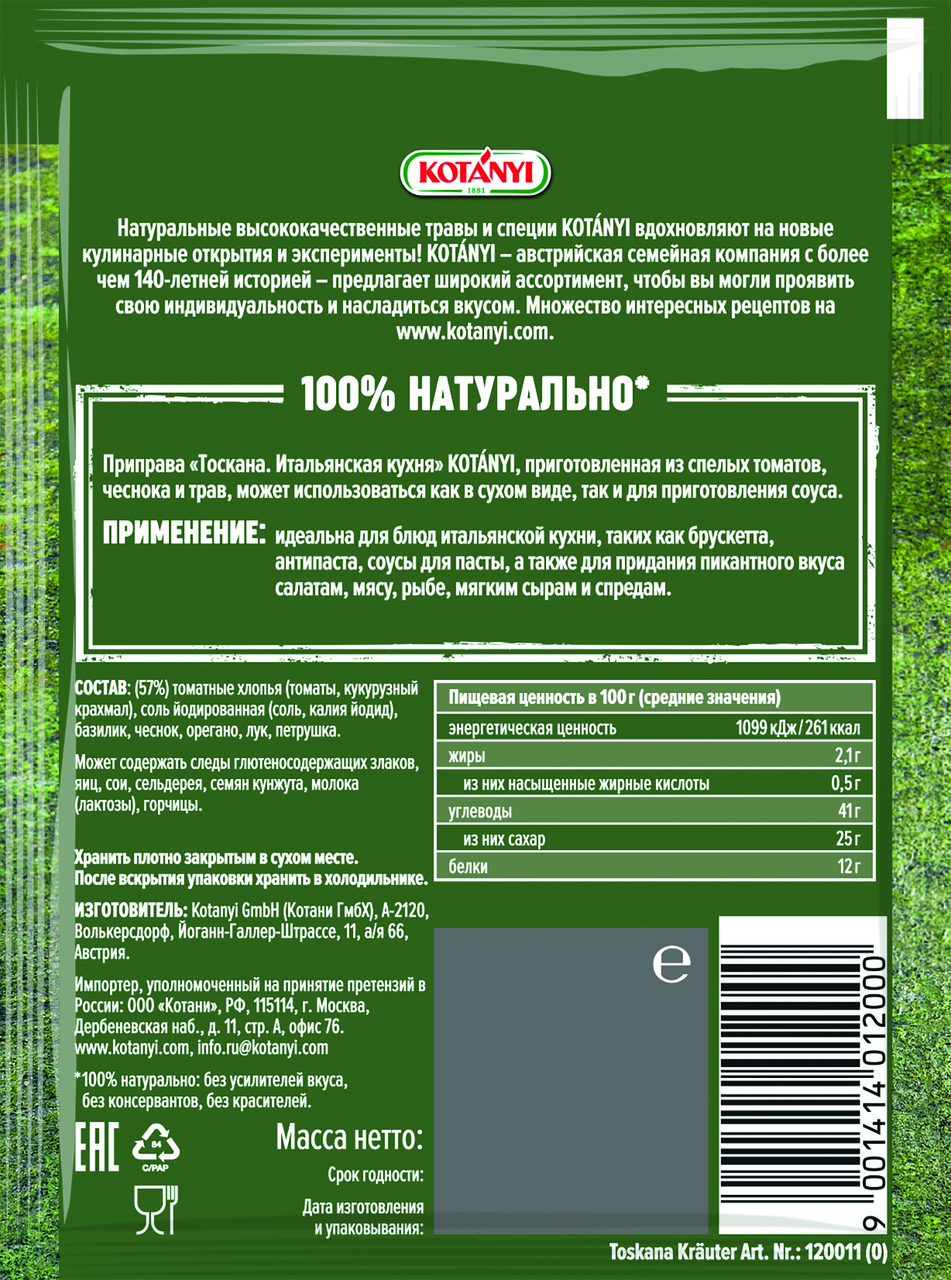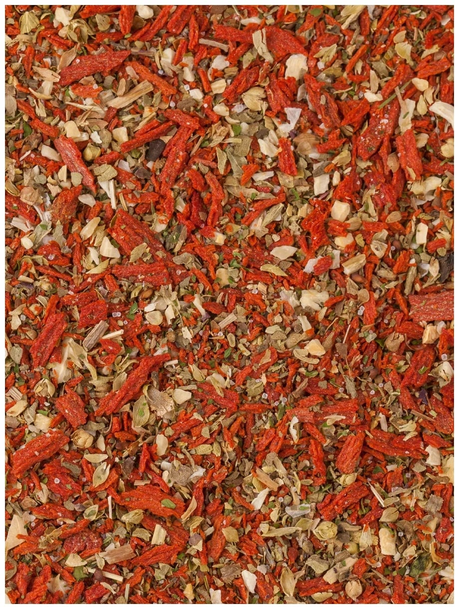 Хлопья томатов (томатная паста, кукурузный крахмал) 57%, соль йодированная (соль калия йодид), базилик, чеснок, лук, орегано, петрушка. Может содержать следы глютеносодержащих злаков, яиц, сои, сельдерея, кунжута, молока (лактозы), орехов, горчицы.