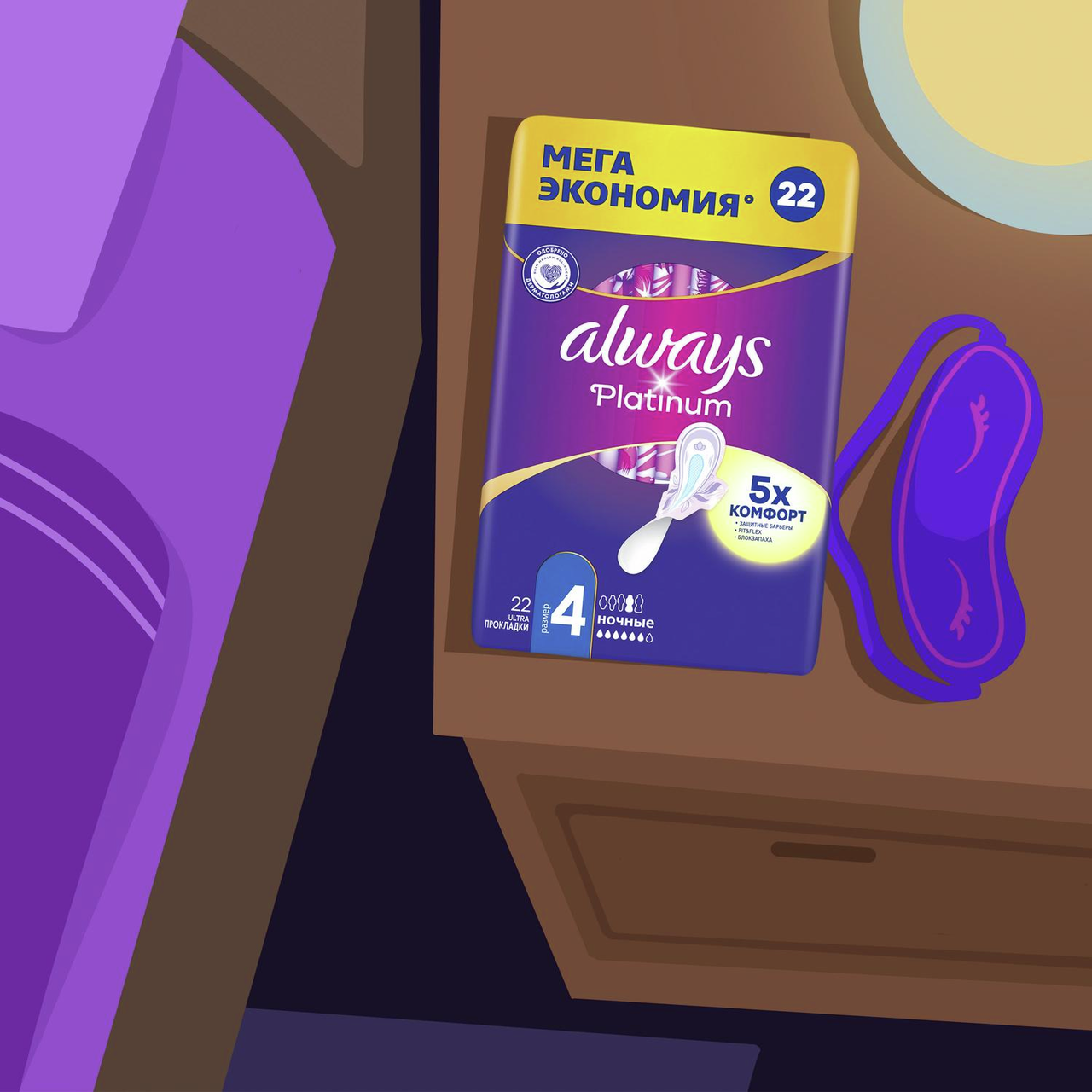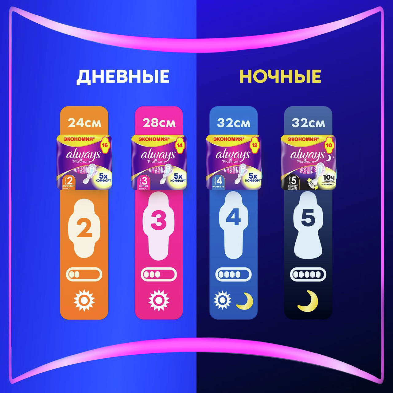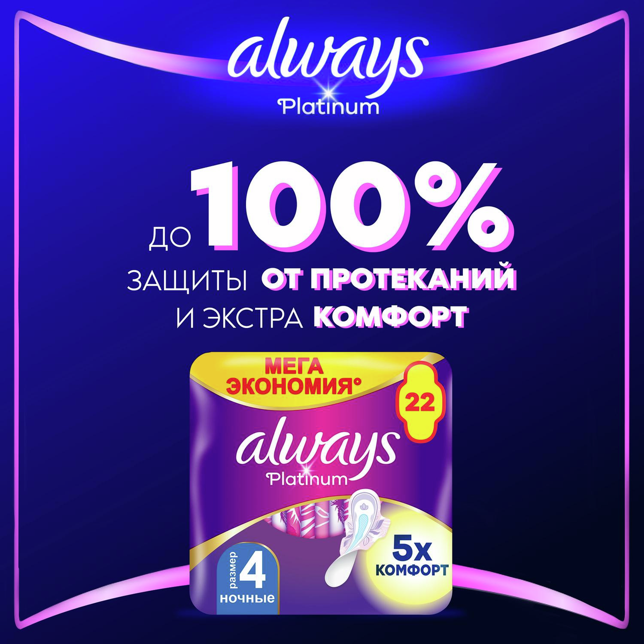 Гигиенические прокладки Always Platinum обеспечивают лучшее сочетание комфорта и защиты среди прокладок Always. Always Platinum более комфортны (по сравнению с Always Ultra) благодаря тысячам микроподушечек и новым, мягким как шелк крылышкам. Они также обеспечивают лучшую защиту (по сравнению с Always Ultra) благодаря защитным боковым барьерам и ультравпитывающему внутреннему слою, который запирает влагу внутри. Always Platinum Ночные (Размер 4) с крылышками рекомендованы для ночного использования или для дневного использования при обильных выделениях. Попробуйте Always Platinum Супер Плюс (Размер 3) для дневного использования при умеренных выделениях. Лучшие комфорт и защита (в линейке Always Ultra). 1000-чи мягких микроподушечек. Мягкие как шелк крылышки. Защитные боковые барьеры. Нейтрализуют неприятные запахи. Ультравпитывающий внутренний слой. Гигиенические прокладки не раздражают кожу (доказано дерматологами).