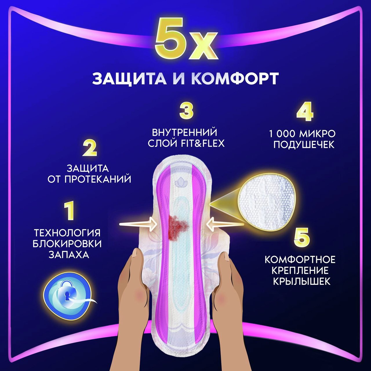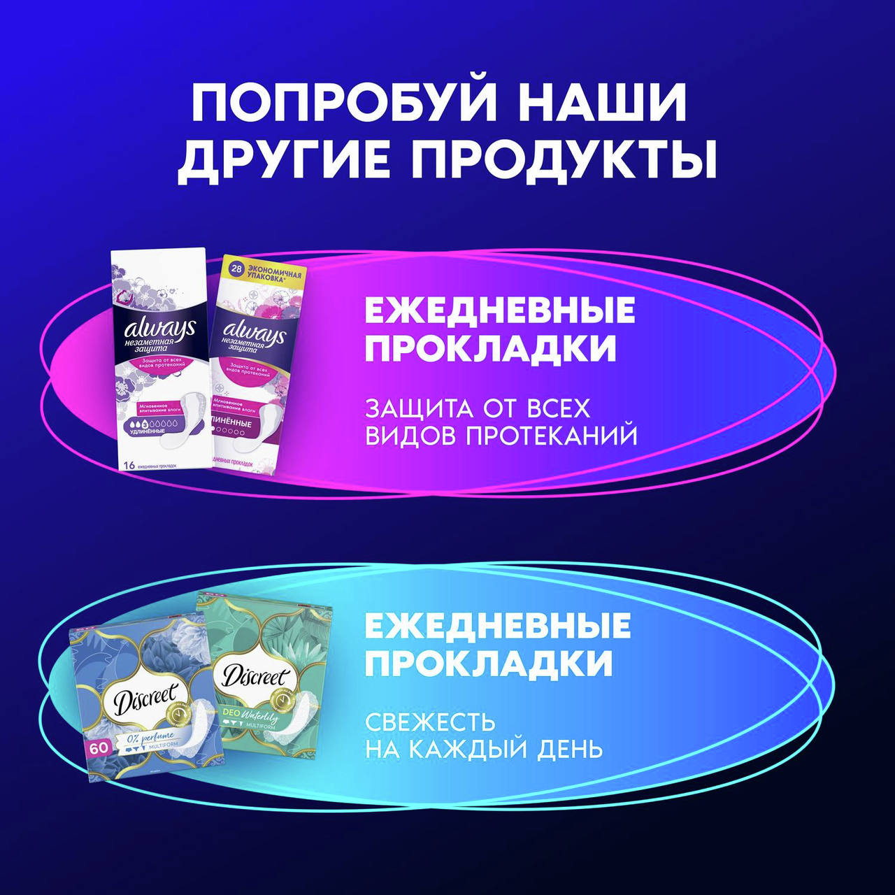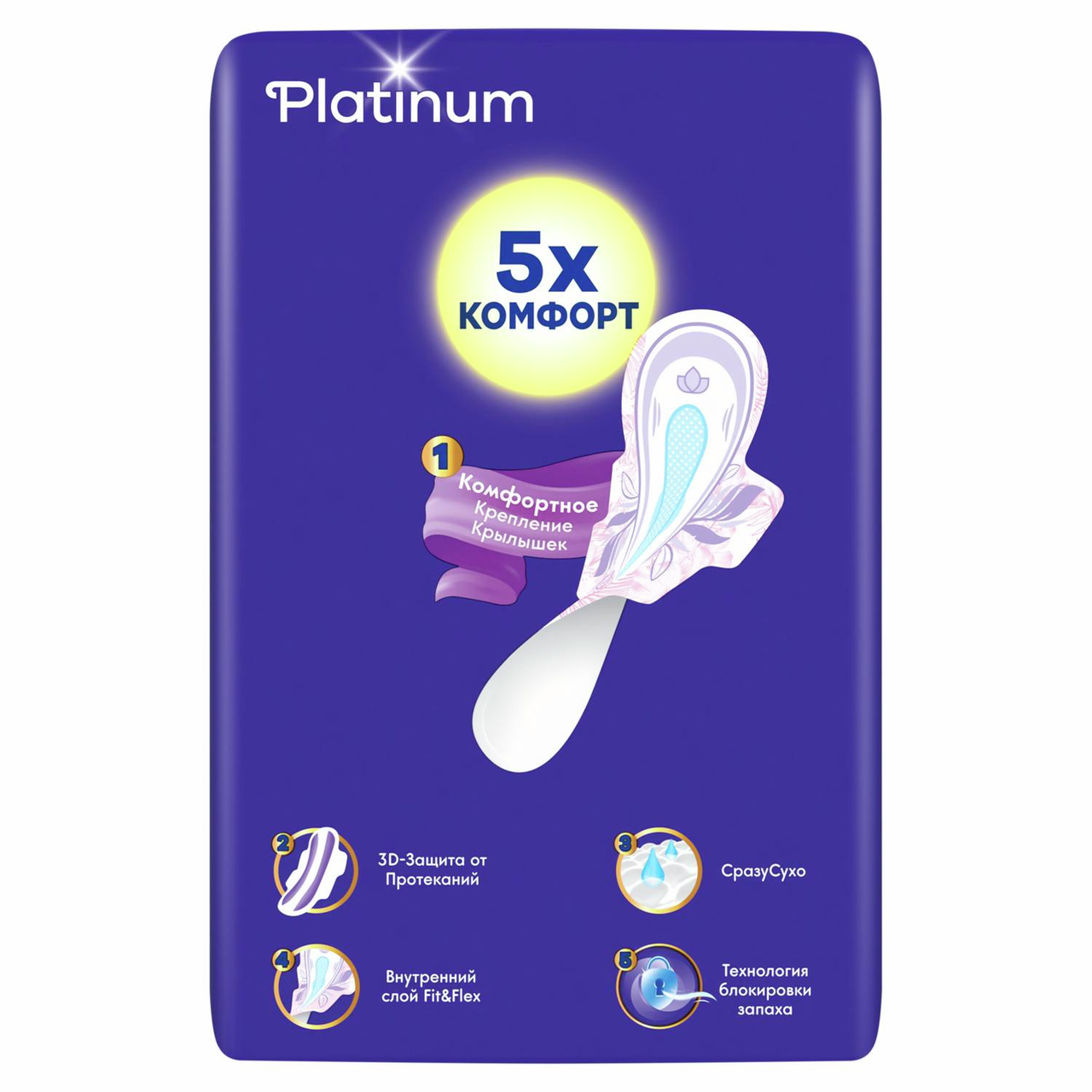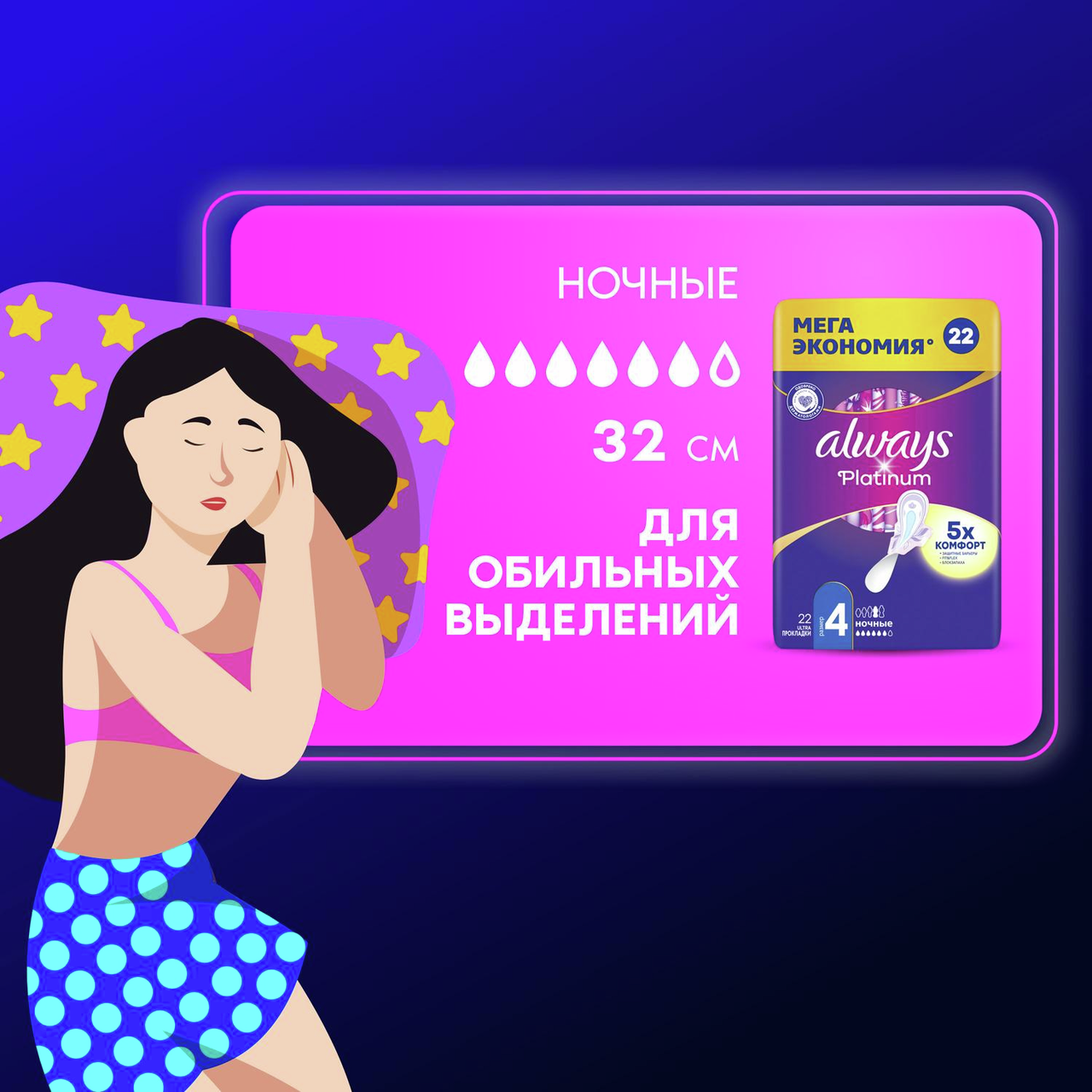 Гигиенические прокладки Always Platinum обеспечивают лучшее сочетание комфорта и защиты среди прокладок Always. Always Platinum более комфортны (по сравнению с Always Ultra) благодаря тысячам микроподушечек и новым, мягким как шелк крылышкам. Они также обеспечивают лучшую защиту (по сравнению с Always Ultra) благодаря защитным боковым барьерам и ультравпитывающему внутреннему слою, который запирает влагу внутри. Always Platinum Ночные (Размер 4) с крылышками рекомендованы для ночного использования или для дневного использования при обильных выделениях. Попробуйте Always Platinum Супер Плюс (Размер 3) для дневного использования при умеренных выделениях. Лучшие комфорт и защита (в линейке Always Ultra). 1000-чи мягких микроподушечек. Мягкие как шелк крылышки. Защитные боковые барьеры. Нейтрализуют неприятные запахи. Ультравпитывающий внутренний слой. Гигиенические прокладки не раздражают кожу (доказано дерматологами).