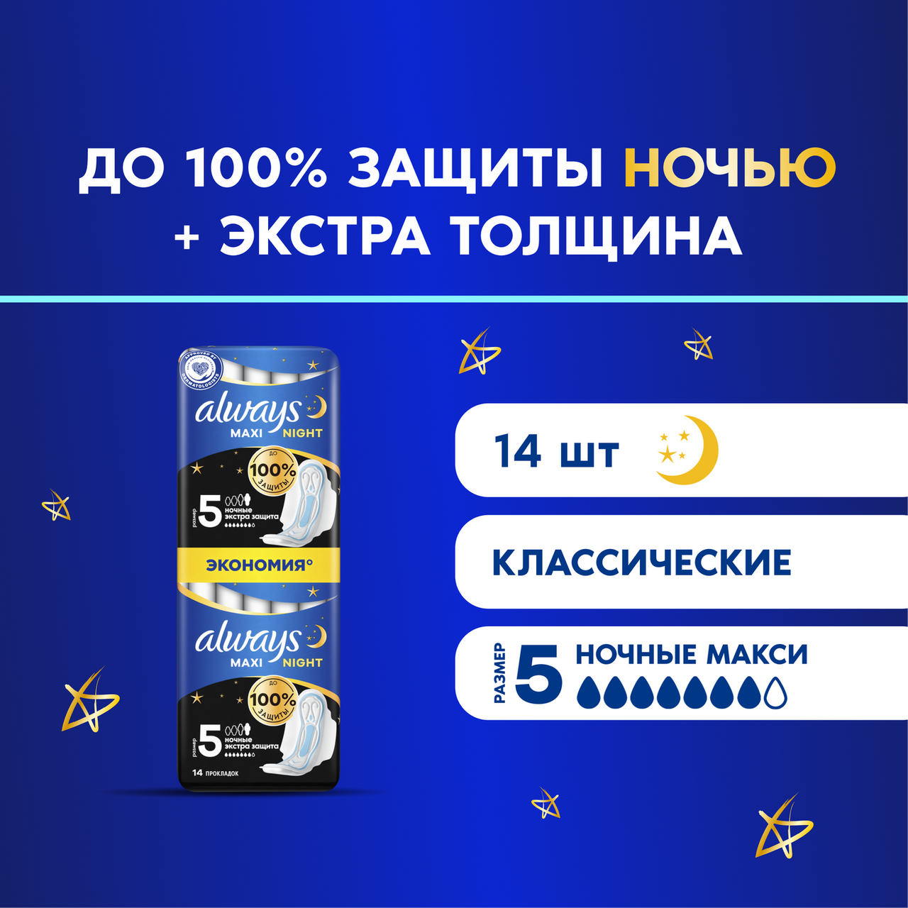 Гигиенические прокладки Always Maxi Normal обеспечивают защиту и комфорт, когда вам это необходимо больше всего. Гигиеническая прокладка Always Maxi Night – это прокладка с дополнительной толщиной, которая обеспечивает до 100% защиты благодаря своим защитным барьерам от протекания по всей поверхности и дополнительному впитывающему внутреннему слою в центре. - Гигиенические прокладки, обеспечивающие до 100% защиты. - Защитные барьеры от протекания по всей поверхности. - Ультравпитывающий внутренний слой. - Комфортный верхний слой. - Одобрены дерматологами Ассоциации здоровья кожи (Skin Health Alliance).