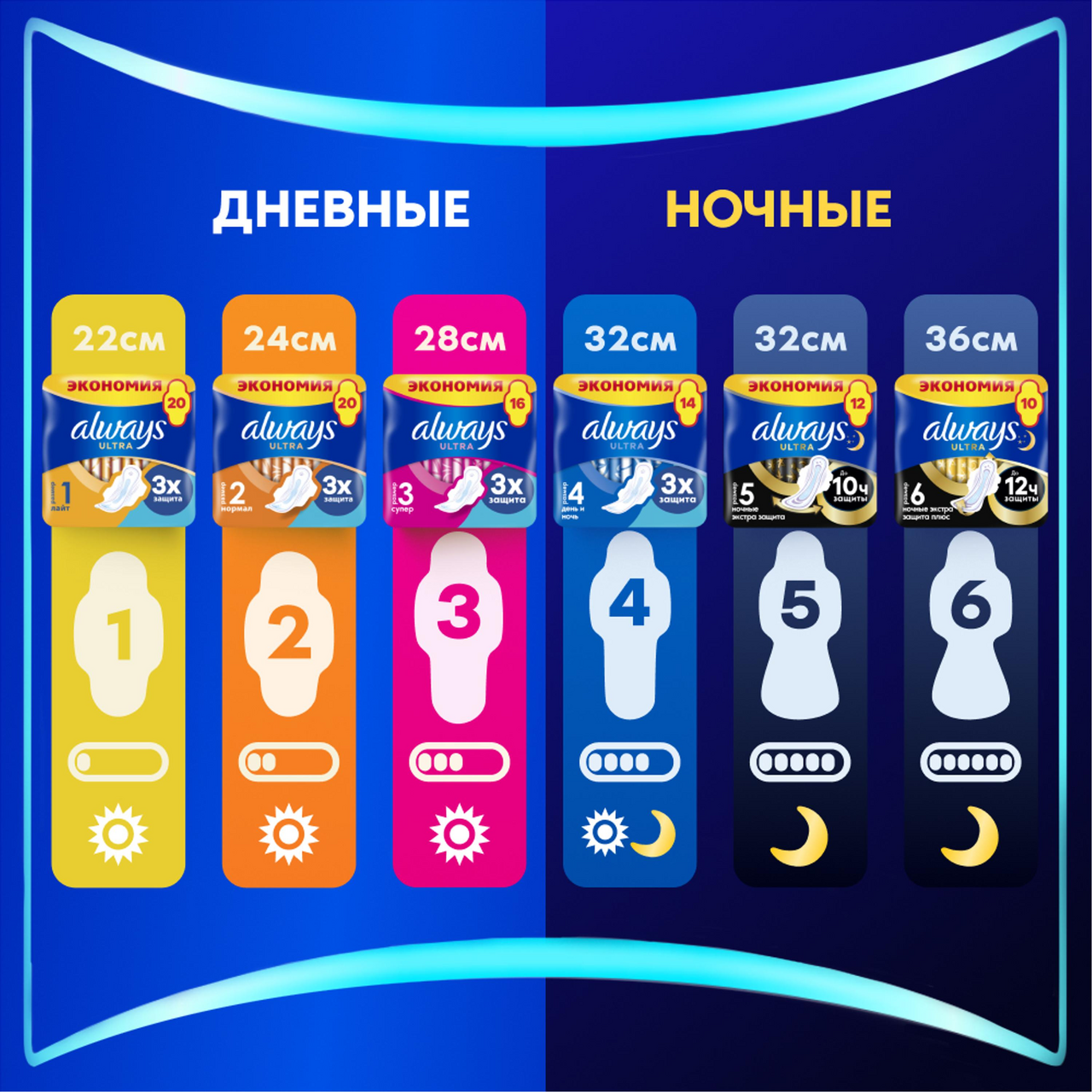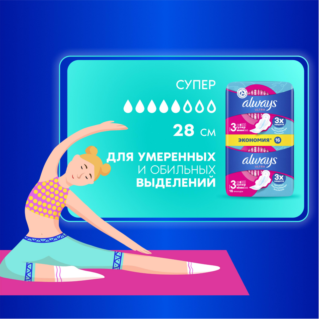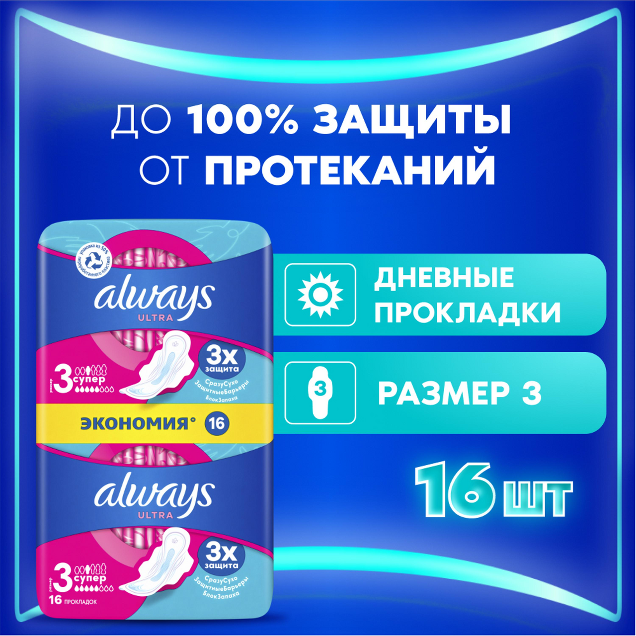 Тройная защита от Always— не соглашайтесь на меньшее: в Always Ultra Супер (Размер 3) с крылышками используется новейшая технология для создания многофункциональной гигиенической прокладки с 3 элементами защиты. Система Сразу сухо впитывает влагу за считаные секунды и не дает ей соприкасаться с кожей. Технология Защитные барьеры удерживает жидкость, предотвращая протекания. Технология Блок запаха нейтрализует неприятные запахи, придавая ощущение свежести и чистоты во время менструации. С Always Ultra вы можете чувствовать себя уверенно весь день. Тройная защита от Always— не соглашайтесь на меньшее. Формула дерматологически одобрена Ассоциацией здоровья кожи (Skin Health Alliance). Попробуйте Always Ultra Secure Night Extra с крылышками— лучшие гигиенические прокладки Always для защиты в ночное время. Обеспечьте себе наилучшую защиту с помощью Always My Fit— специальной системы определения размера, которая помогает правильно подобрать прокладку Always на основании количества выделений и размера трусиков. Супервпитывающий внутренний слой с системой Сразу сухо, которая впитывает жидкость за считаные секунды. Технология Защитные барьеры удерживает жидкость, предотвращая протекания. Технология Блок запаха нейтрализует неприятные запахи. Гигиенические прокладки не раздражают кожу (доказано дерматологами). Крылышки помогают удерживать прокладку на месте для надежной защиты и ощущения комфорта.