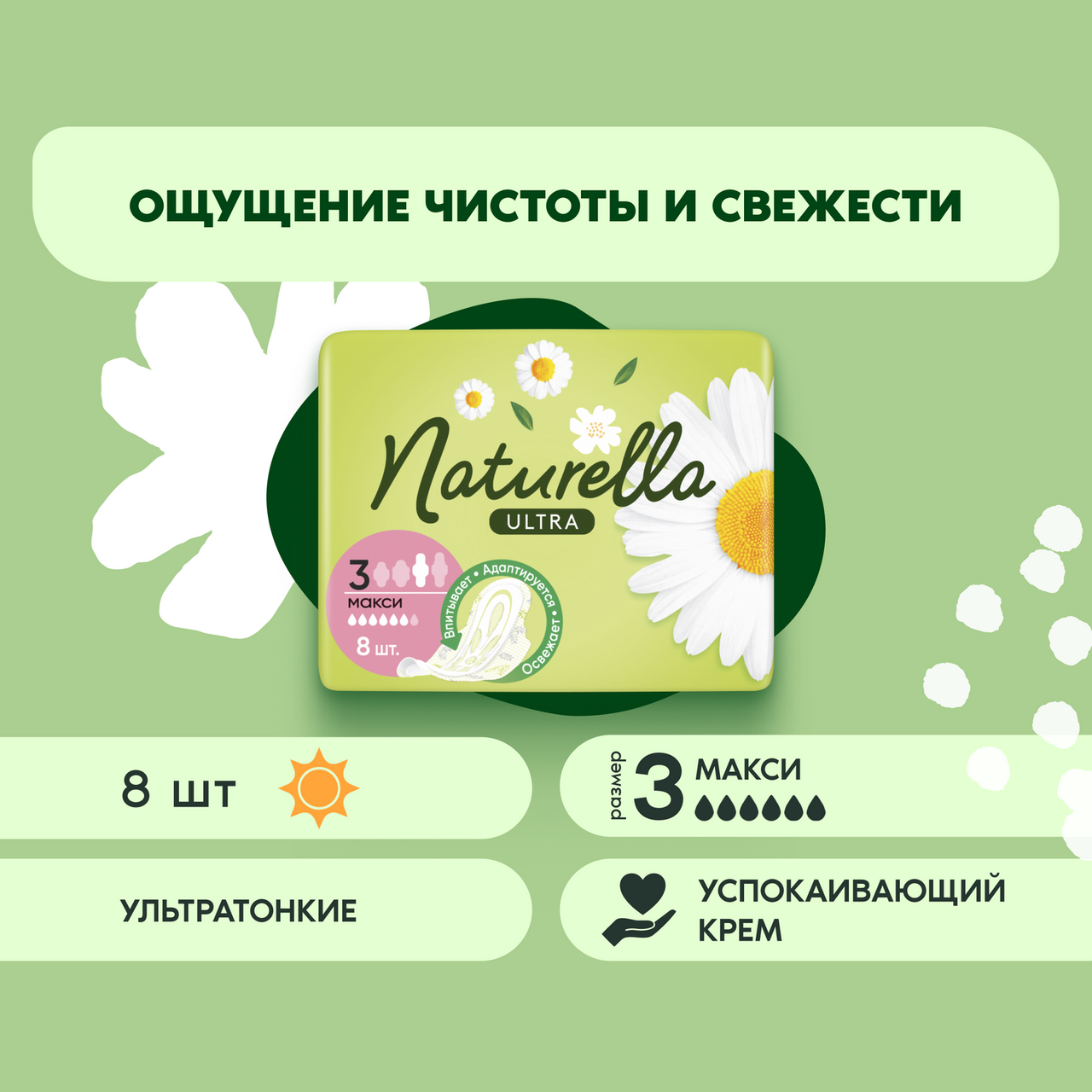 Мягкие гигиенические прокладки Naturella Ultra Maxi Ромашка с крылышками, помогающими надежно фиксировать прокладку, более длинные (по сравнению с Naturella Ultra Normal) и обеспечивают дополнительную защиту кожи в интимной зоне в дневное время при обильных выделениях. Еще больше защиты при обильных выделениях. Обеспечивают защиту и заботятся о самой деликатной коже, одобрены дерматологами. Содержат успокаивающий лосьон Dermacrem, который покрывает кожу тонким защитным слоем и предотвращает раздражение. Необычайно мягкий верхний слой с эксклюзивной впитывающей системой для защиты от протеканий. Гигиенические прокладки с легким ароматом ромашки помогают справиться с неприятным запахом во время менструации. Толщина 2 мм для комфорта и свободы движений. Гигиенические прокладки в индивидуальной упаковке для удобства защиты и ухода в дороге.