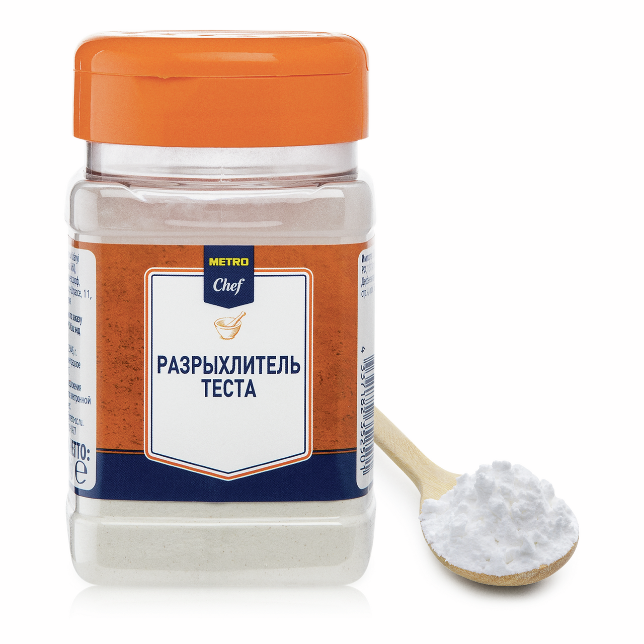 Разрыхлитель теста METRO Chef, 285 г — популярная и распространенная пищевая добавка, которая помогает сделать выпечку высокой, мягкой, нежной и воздушной. Его активно используют как в производственной кулинарии, так и в домашних условиях. Мягкие пирожки, пышные булочки, оладьи и сырники не обойдутся без разрыхляющей смеси. Добавка не только улучшает внешний вид готового блюда, но и делает его более вкусным и аппетитным. Разрыхлитель можно добавлять в песочное тесто, дрожжевое и пресное. За счет выделения углекислого газа шарлотка, котлета в тесте, пицца, блинчики будут более объемными и легкими. При термической обработке происходит химическая реакция и газ образует пустоты, за счет чего тесто сильно поднимается.