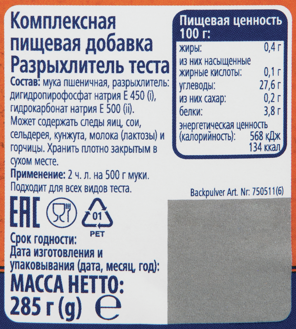 Мука пшеничная, разрыхлитель: дигидропирофосфат натрия Е450 (i), гидрокарбонат натрия Е450 (i, i).