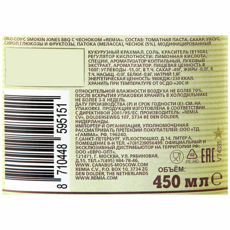 Барбекю-соус с чесноком Jones Remia, 450 мл представляет собой уникальное дополнение к любому блюду, обжаренном на мангале, гриле, углях или открытом огне. Его основу составляют томатная паста и рапсовое масло, а также горчица, пряности. Отличительной особенностью продукта стал дымный аромат, полученный благодаря копчению Гикори, редкого орехового дерева. Барбекю-соус подходит к свинине или говядине, потому что обладает умеренно-острым вкусом, также сочетается с жареными куриными крылышками, некоторыми видами стейков. Продукт используют как во время презентации блюд, так и в процессе приготовления бургеров, рыбы. Глянцевый блеск и глазурь мясо приобретает после жарки за счет сиропу глюкозы.