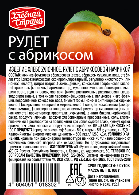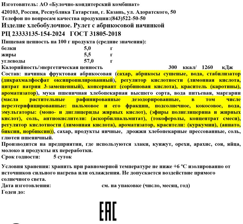 Начинка фруктовая абрикосовая (сахар, абрикосы сушеные, вода, стабилизатор (дикрахмалфосфат оксипропилированный), регулятор кислотности (лимонная кислота, цитрат натрия 3-замещенный), консервант (сорбиновая кислота), краситель (каротины), ароматизатор), мука пшеничная хлебопекарная высшего сорта, вода питьевая, маргарин (масла растительные рафинированные дезодорированные, в том числе переэтерифицированные: пальмовое и его фракции, подсолнечное, кокосовое, вода, эмульгаторы: (моно- и диглицериды жирных кислот), (эфиры полиглицерина и жирных кислот), соль, антиокислители: (аскорбилпальмитат), (токоферолы, концентрат смеси), регулятор кислотности (лимонная кислота), ароматизатор, красители: (куркумин), (аннато, биксин, норбиксин)), сахар, продукты яичные, дрожжи хлебопекарные прессованные, соль, глютен пшеничный.