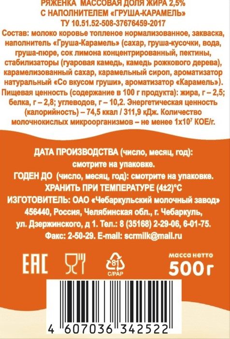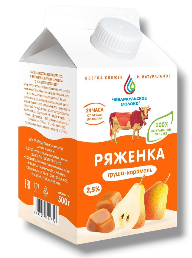 Ряженка Чебаркульское молоко груша и карамель 2.5%, 500г полезный кисло-молочный продукт со вкусом Груши и карамели.