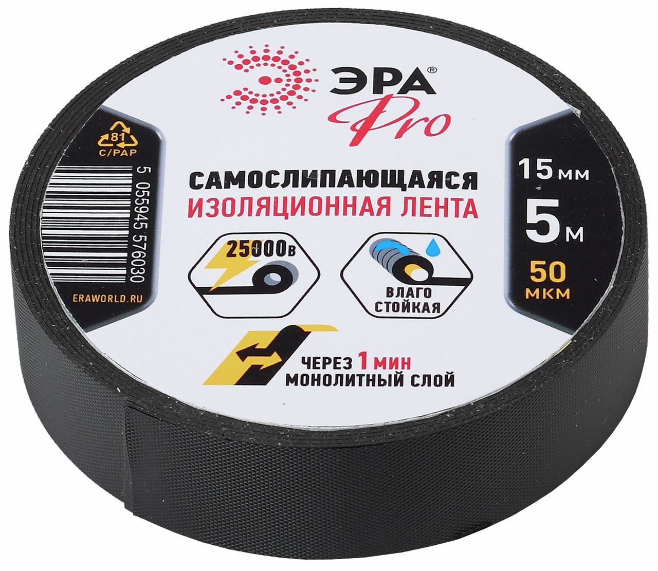 Лента изоляционная самослипающаяся Эра Pro черная, 15мм х 5м