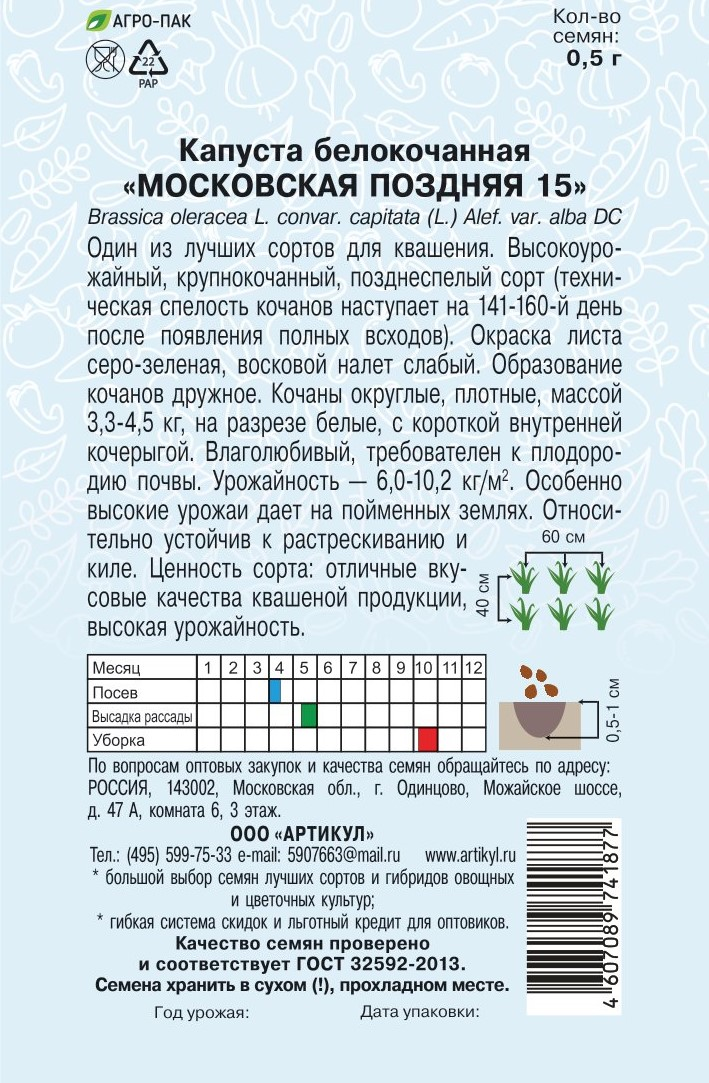 Семена Артикул Капуста Белокочанная Московская Поздняя 15, 10г