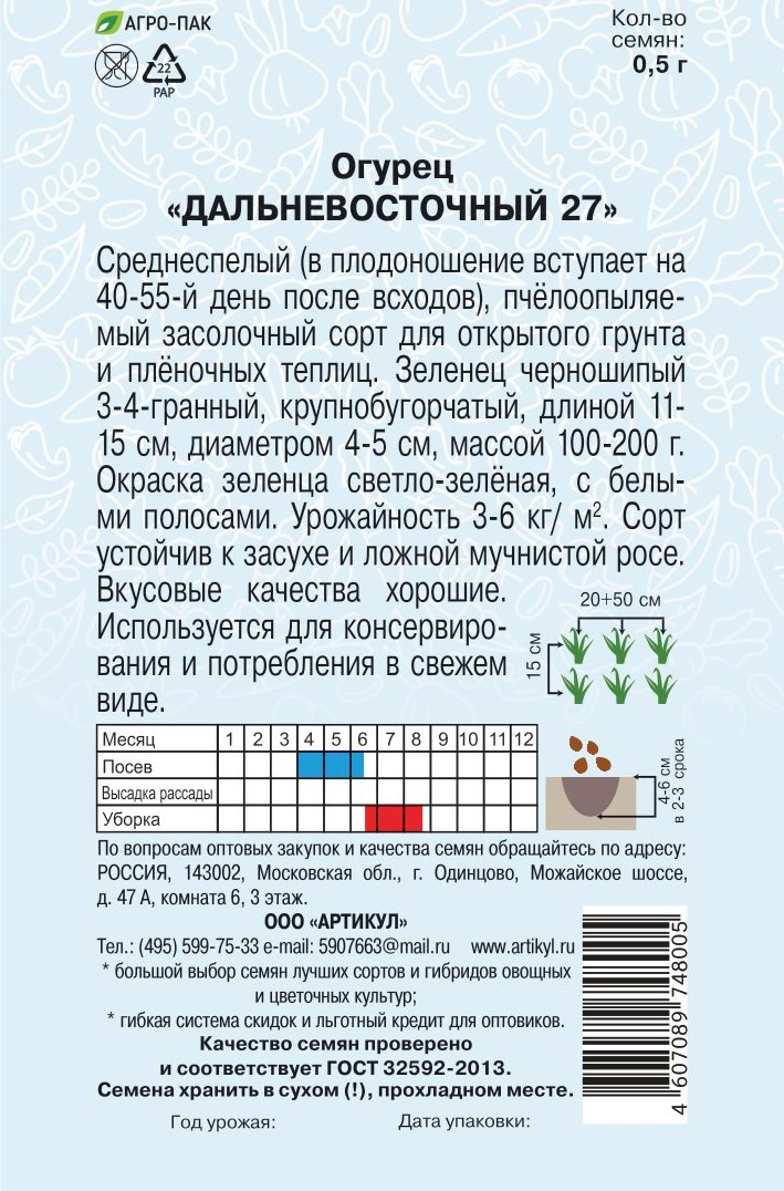 Семена Артикул Огурец Дальневосточный 27, 10г