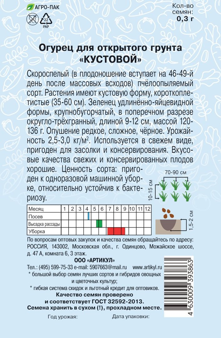 Скороспелый (в плодоношение вступает на 46-49-й день после массовых всходов) пчёлоопыляемый сорт. Растения имеют кустовую форму, короткоплетистые (35-60 см). Зеленец удлинённо-яйцевидной формы, крупнобугорчатый, в поперечном разрезе округло-трёхгранный, длиной 9-12 см, массой 120-136 г. Опушение редкое, сложное, чёрное. Урожайность 2,5-3,0 кг/м2. Используется в свежем виде, пригоден для засолки и консервирования. Вкусовые качества свежих и консервированных плодов хорошие. Ценность сорта: пригоден к одноразовой машинной уборке, относительно устойчив к бактериозу. + Огурцы способствуют усвоению пищи и выводу шлаков из организма.