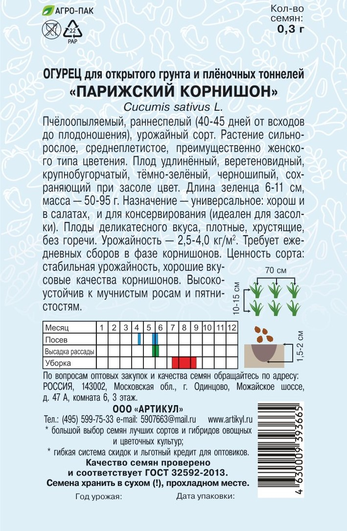 Семена Артикул Огурец Парижский Корнишон, 10г