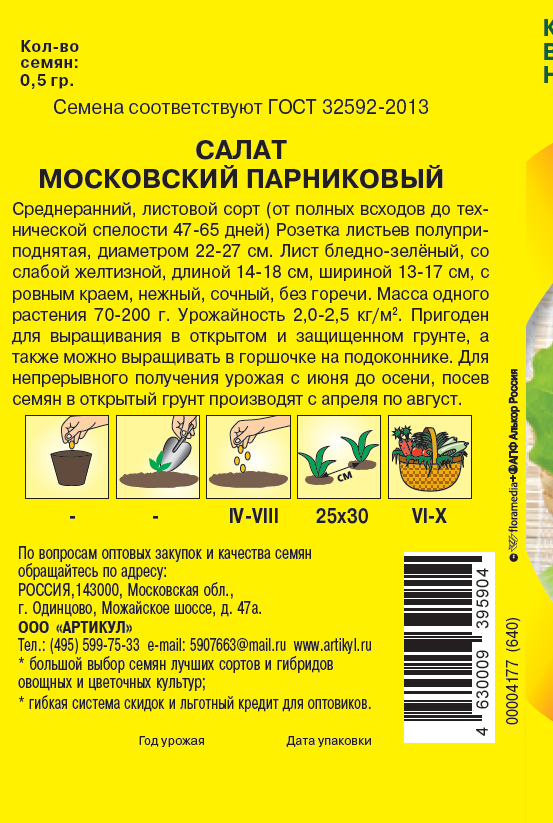 Среднеранний, листовой сорт (от полных всходов до технической спелости 47-65 дней) Розетка листьев полуприподнятая, диаметром 22-27 см. Лист бледно-зелёный, со слабой желтизной, длиной 14-18 см, шириной 13-17 см, с ровным краем, нежный, сочный, без горечи. Масса одного растения 70-200 г. Урожайность 2,0-2,5 кг/м2. Пригоден для выращивания в открытом и защищенном грунте, а также можно выращивать в горшочке на подоконнике. Для непрерывного получения урожая с июня до осени, посев семян в открытый грунт производят с апреля по август.