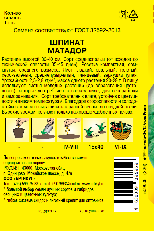 Семена Артикул Дисплей 37 эконом шпинат матадор