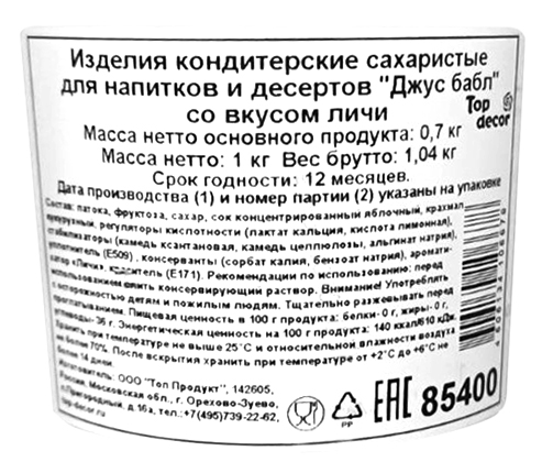 Патока, фруктоза, сахар, пюре личи, регуляторы кислотности лактат кальция, кислота лимонная, стабилизаторы камедь ксантановая, камедь целлюлозы, альгинат натрия, уплотнитель Е509, консерванты сорбат калия, бензонат натрия, ароматизатор натуральный Личи, краситель Е129.