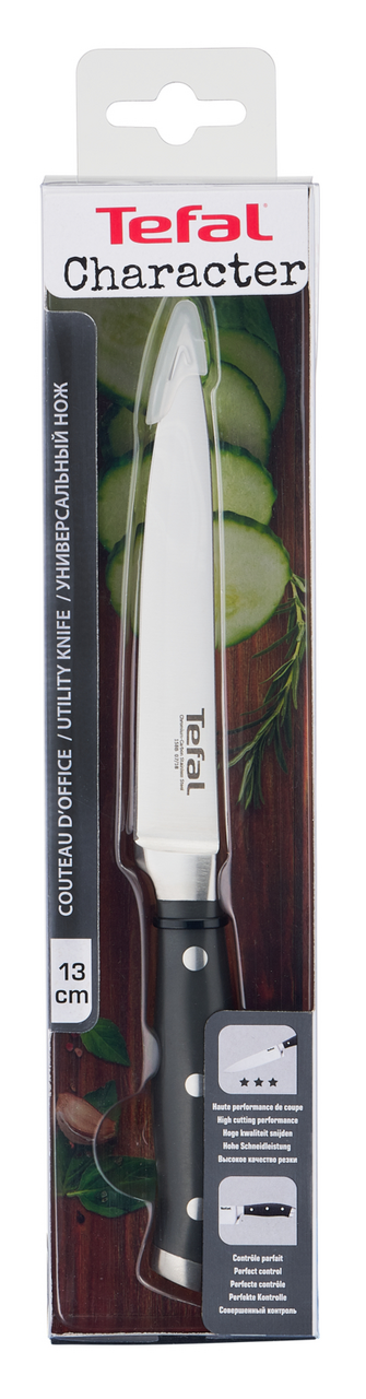 Нож универсальный Tefal Character, 12,5 см — универсальный нож с широким лезвием, который идеально подходит для резки и рубки продуктов. Он изготовлен из прочной и долговечной стали, благодаря чему на протяжении всего срока службы сохраняет остроту заточки. Он подходят для обработки различных продуктов с минимальным усилием, поэтому применять их следует с осторожностью. Эргономичная рукоять удобно располагается в ладони, не выскальзывает, гарантируя безопасность в процессе работы. Клинок устойчив к коррозии, не поддается царапинам и деформации лезвия. Нож обладают стильным и интересным дизайном и на протяжении всего периода применения сохраняет презентабельный внешний вид. Поверхность изделия гладкая, практичная и гигиеничная. Она легко отмывается от различных загрязнений под проточной водой с жидким моющим средством. Перед хранением прибор рекомендуется насухо протереть полотенцем, что предупредит появление разводов и следов от капель.