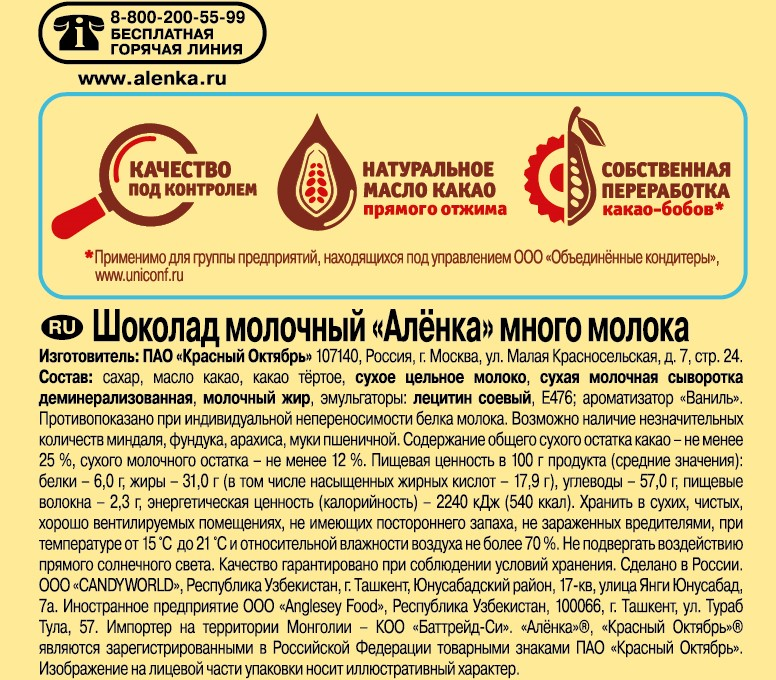 Когда в классическую Алёнку пролили молоко, получился особенно нежный шоколад с мягким молочным вкусом. Шоколад Алёнка - Много молока тает во рту, окутывая молочно-сливочной сладостью, словно пушистым одеялом. Для особо притязательных сластен и гурманов, любящих насыщенные сливочные оттенки во вкусе и аромате.