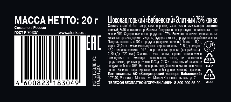 Элитный шоколад Бабаевский для настоящих ценителей темного шоколада. Минимум 75% какао-продуктов - утонченная шоколадная горечь, глубокий вкус и легкие оттенки ванили в насыщенном аромате. Традиционный Бабаевский принт - знак качества и отменного вкуса. Удовольствие для истинных шоколадных гурманов.