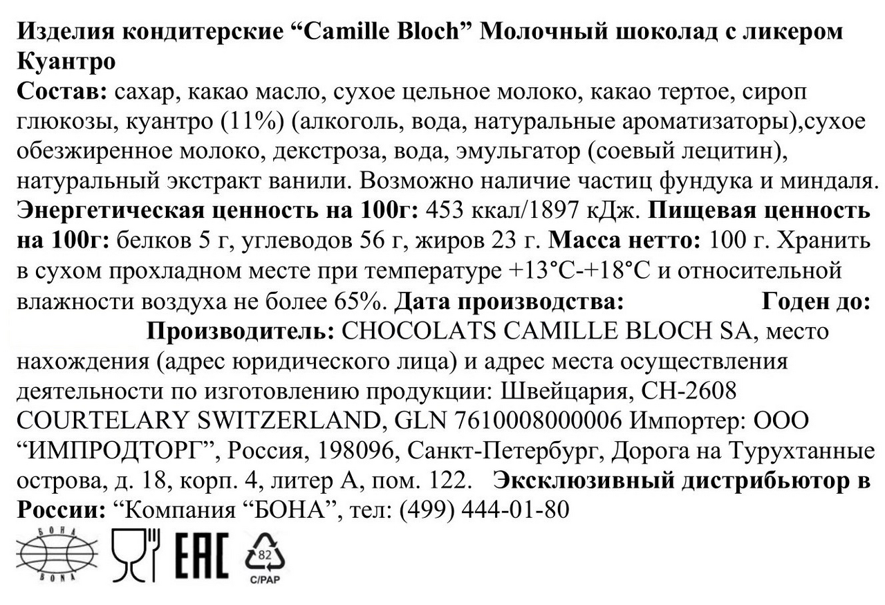 Шоколад Camille Bloch молочный с ликером Куантро, 100г
