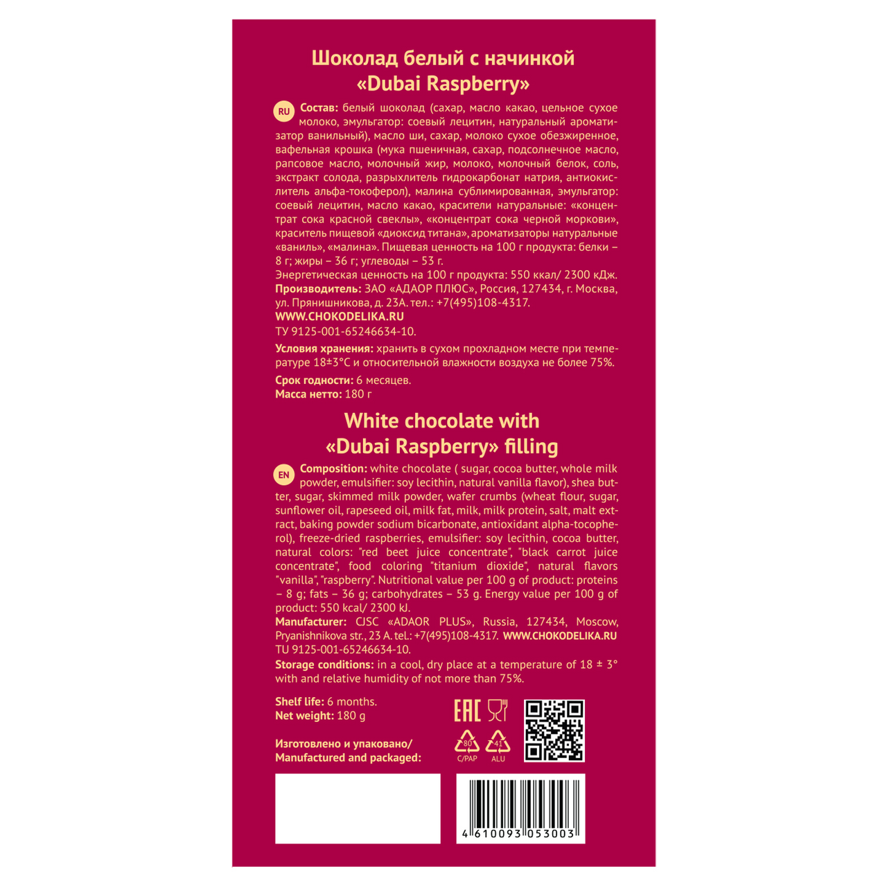 В каждом кусочке шоколада Dubai Raspberry раскрывается гармоничное сочетание белого шоколада и нежной малиновой начинки с вафельной крошкой. Идеальная комбинация текстуры и вкуса делает этот шоколад настоящим произведением кондитерского искусства, способным удивить даже самых искушенных гурманов.