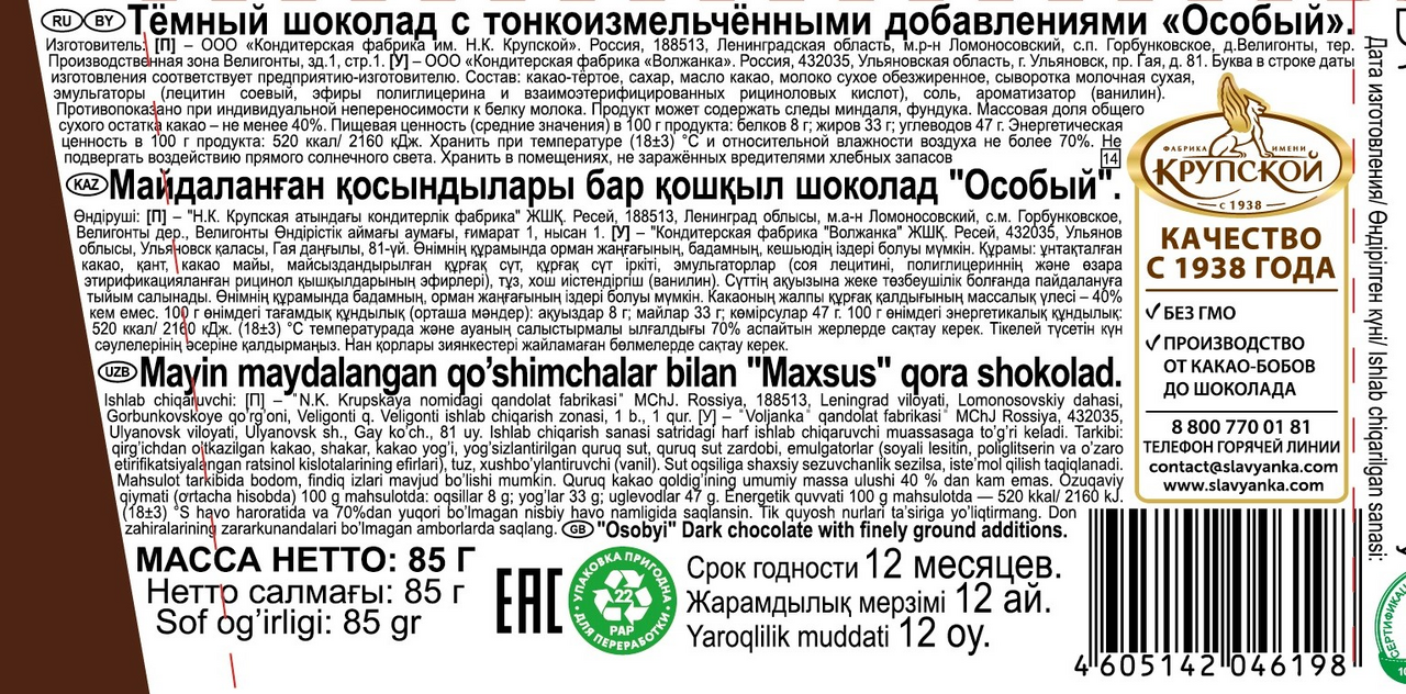 Темный шоколад с тонкоизмельчёнными добавлениями Особый. Представляет собой изысканный и вкусный десерт, который придется по вкусу любителям классического горького шоколада. Шоколад Особый подходит для употребления в пост, так как не содержит никаких добавок и ГМО.