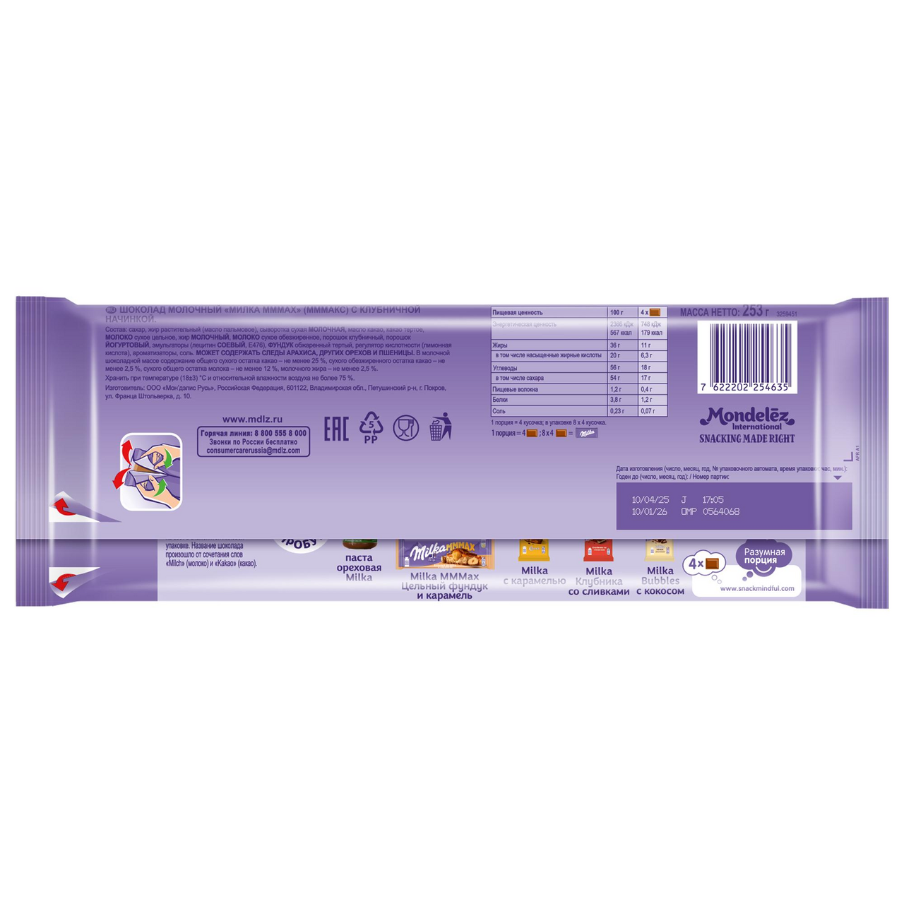Участвует в конкурсе: Выиграйте кофемашину на сладкое! Совершите покупку товаров-участников на сумму от 1500₽ с 23 октября 2025г. по 14 января 2026г. и получите шанс выиграть кофемашину или другие сладкие призы! Чем больше покупок - тем больше шансов на победу! Подробнее об акции - https://cdn.metro-cc.ru/ru/mndlz_2025.pdf. Это радость для всей семьи - карнавал вкуса, мечта шоколадного гурмана и просто рай для сладкоежки. Огромная плитка молочного шоколада с клубничной начинкой. Нежное сочетание компонентов в классической рецептуре оттеняет оригинальная добавка. Продукт изготовлен из натурального альпийского молока и проверенных ингредиентов. Это изумительное сочетание молочного шоколада и натурального клубничного пюре. Такое лакомство, несомненно, придется по вкусу и взрослым, и детям. Шоколад станет приятным подарком-комплиментом кому угодно.