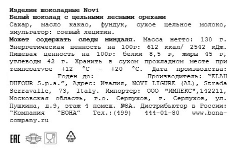 Сахар, масло какао, фундук, сухое цельное молоко, эмульгатор: соевый лецитин.