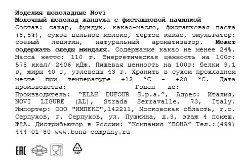 Сахар, фундук, фисташковая паста (8,5%), молоко сухое цельное, масло какао, тертое какао, эмульгатор: лецитин соевый, натуральный ароматизатор.